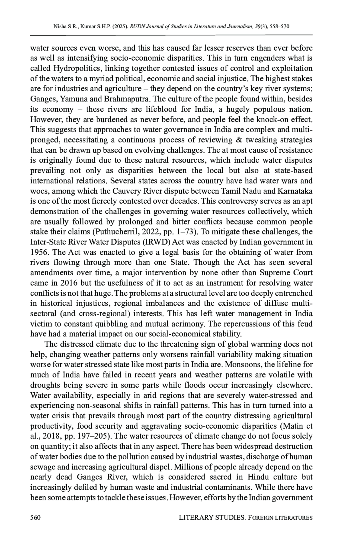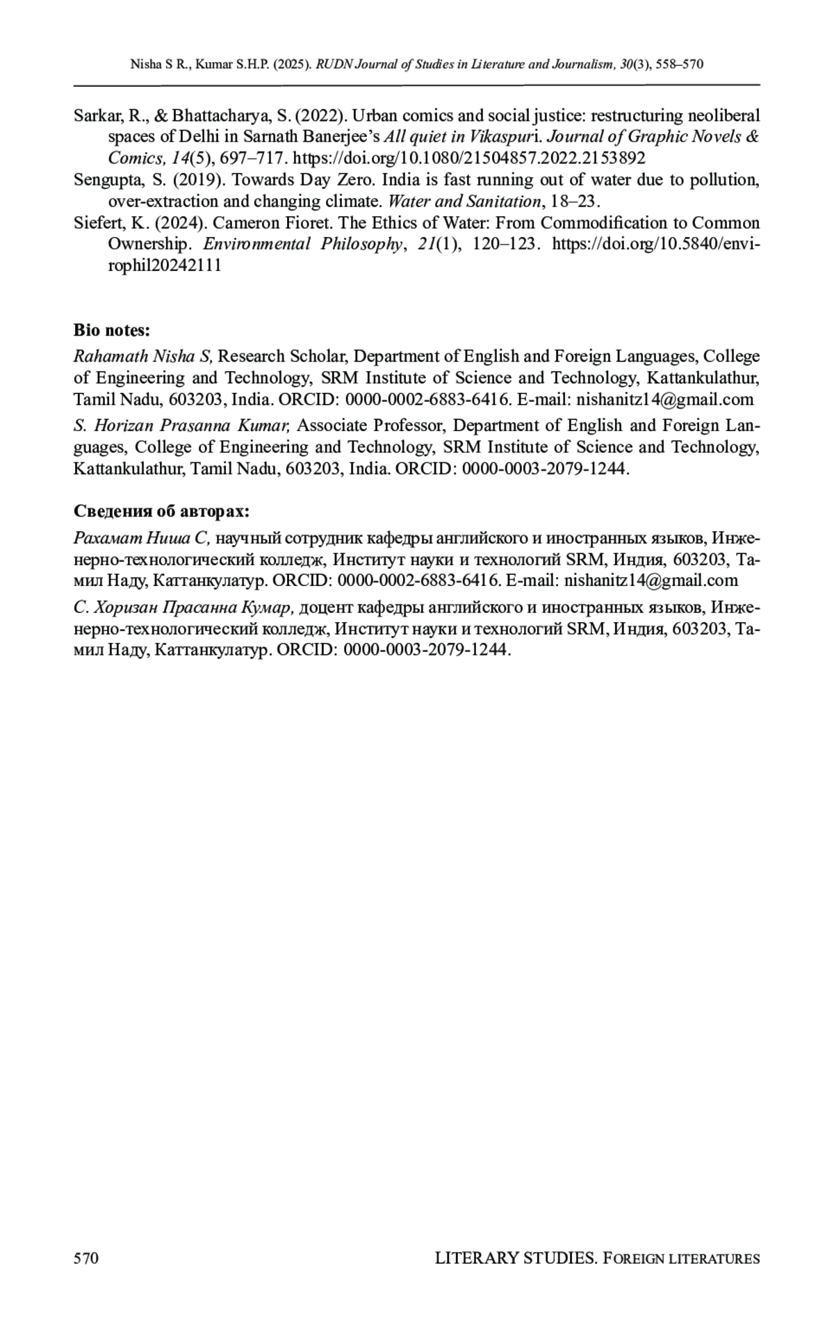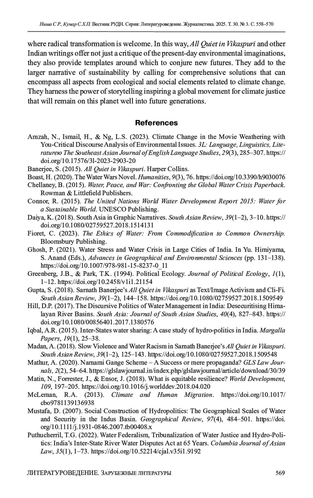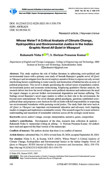 НИША Р. С., КУМАР С. Х. ЧЬЯ ВОДА? КРИТИЧЕСКИЙ АНАЛИЗ ИЗМЕНЕНИЯ КЛИМАТА, ГИДРОПОЛИТИКИ И ЭКОЛОГИЧЕСКОЙ СПРАВЕДЛИВОСТИ В ИНДИЙСКОМ ГРАФИЧЕСКОМ РОМАНЕ «В ВИКАСПУРИ ВСЕ СПОКОЙНО» // ВЕСТНИК РОССИЙСКОГО УНИВЕРСИТЕТА ДРУЖБЫ НАРОДОВ. СЕРИЯ: ЛИТЕРАТУРОВЕДЕНИЕ. ЖУРНАЛИСТИКА. 2025. ТОМ 30 № 3
