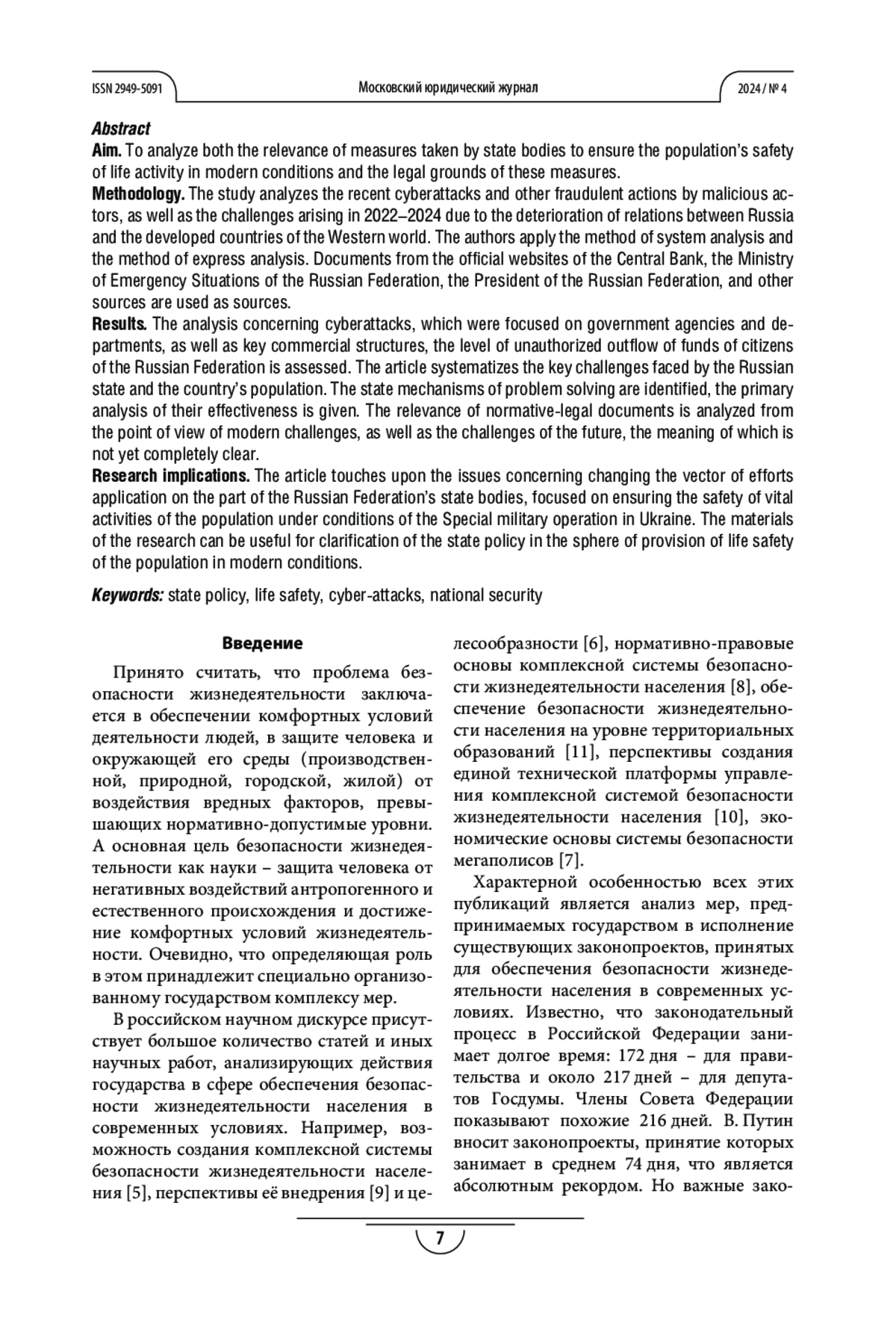 Цель. Проанализировать актуальность мер, предпринимаемых государственными органами для обеспечения безопасности жизнедеятельности населения в современных условиях, и юридические основания этих мер.