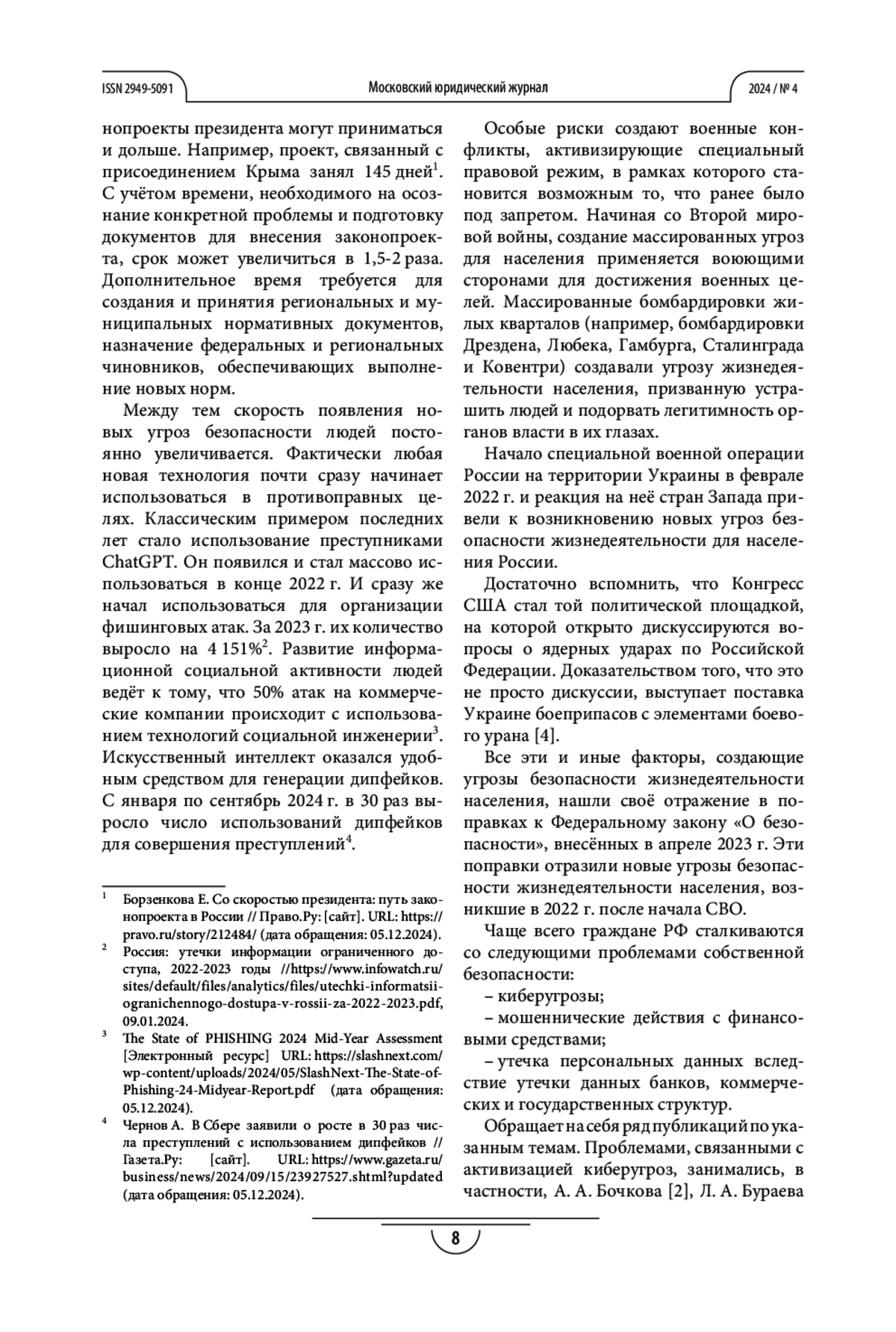Результаты. Проведён анализ, касающийся кибератак, ориентированных на государственные структуры и ведомства, а также ключевые коммерческие структуры, оценён уровень несанкционированного оттока денежных средств граждан Российской Федерации. Систематизированы ключевые вызовы, перед которыми оказались российское государство и население страны. Выявлены государственные механизмы решения проблем, дан первичный анализ их эффективности. Рассмотрена актуальность нормативно-правовых документов с точки зрения современных вызовов, а также вызовов будущего, смысл которых пока ещё до конца не ясен.