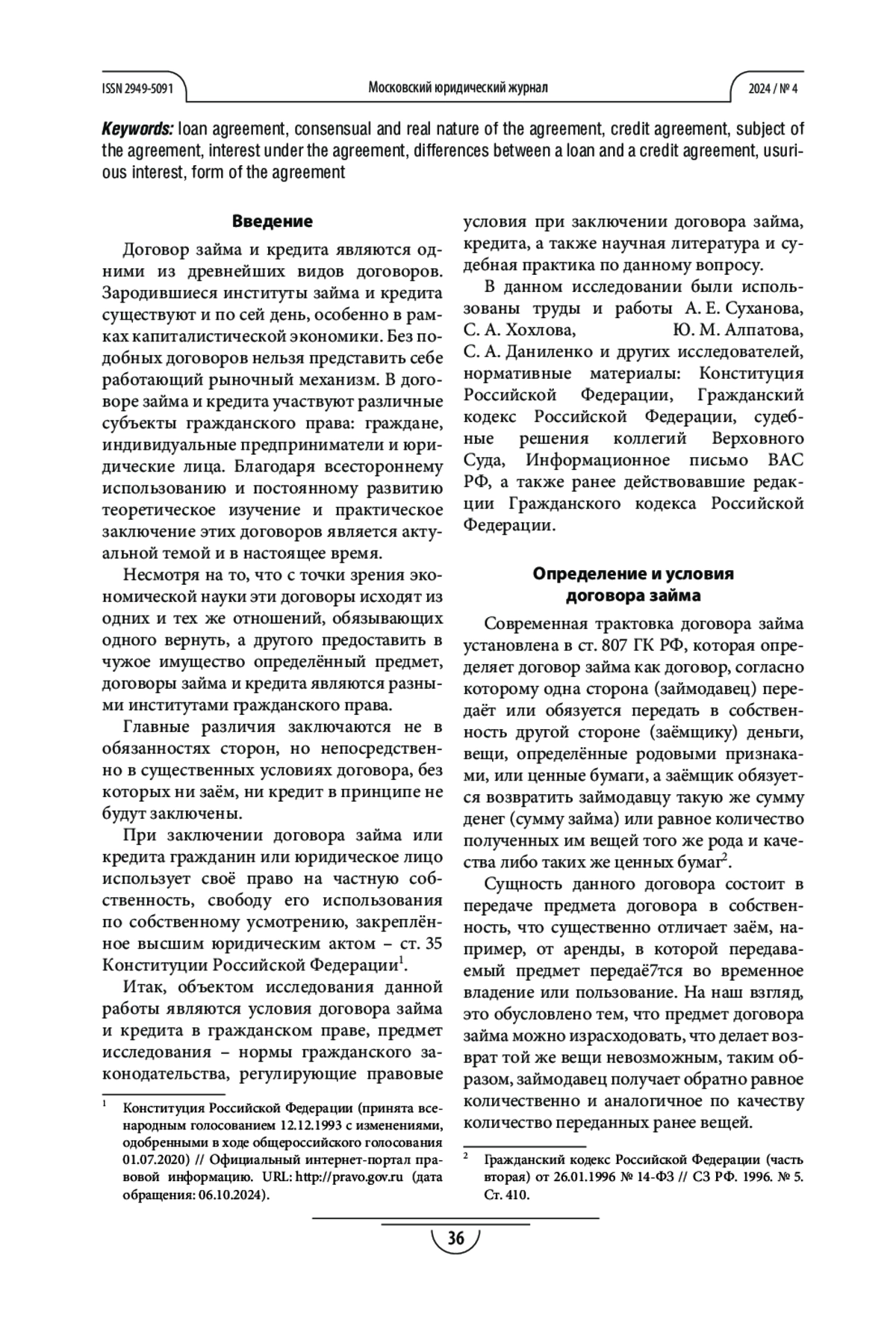 1. Алексеев Н. В., Горбачев А. А. Некоторые аспекты заключения договора займа по российскому законодательству // Экономика. Социология. Право. 2022. № 3. С. 60-64.