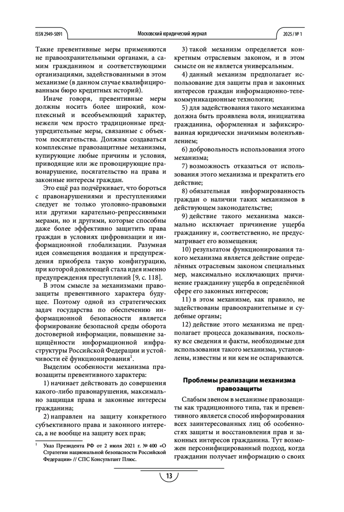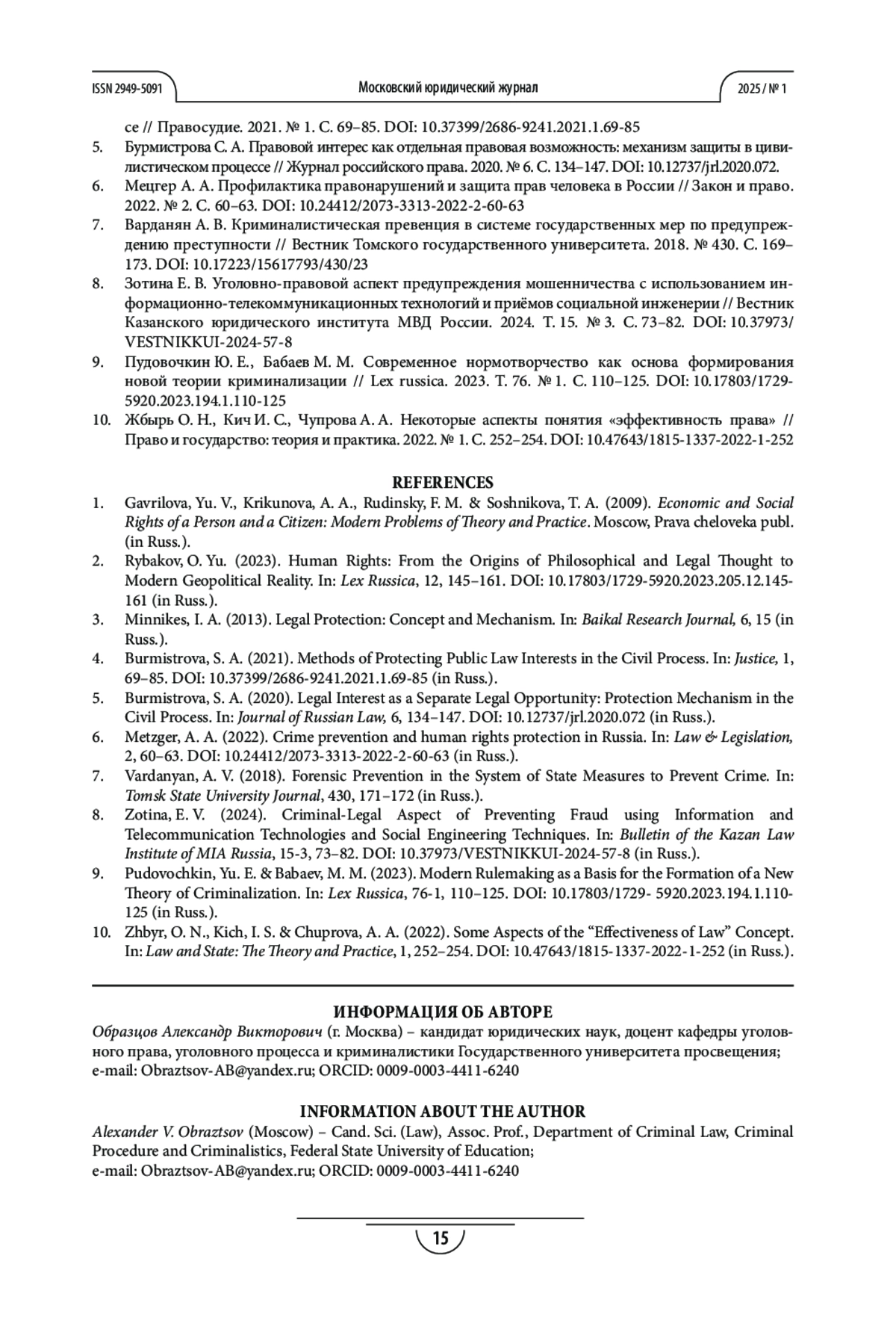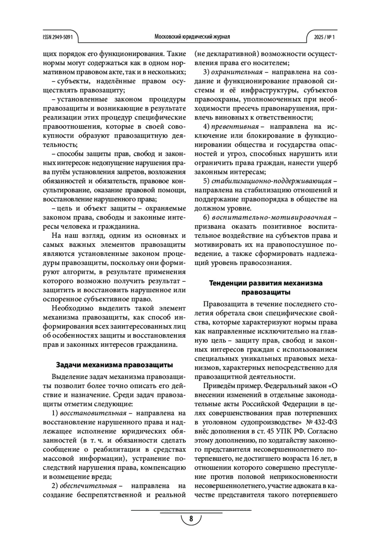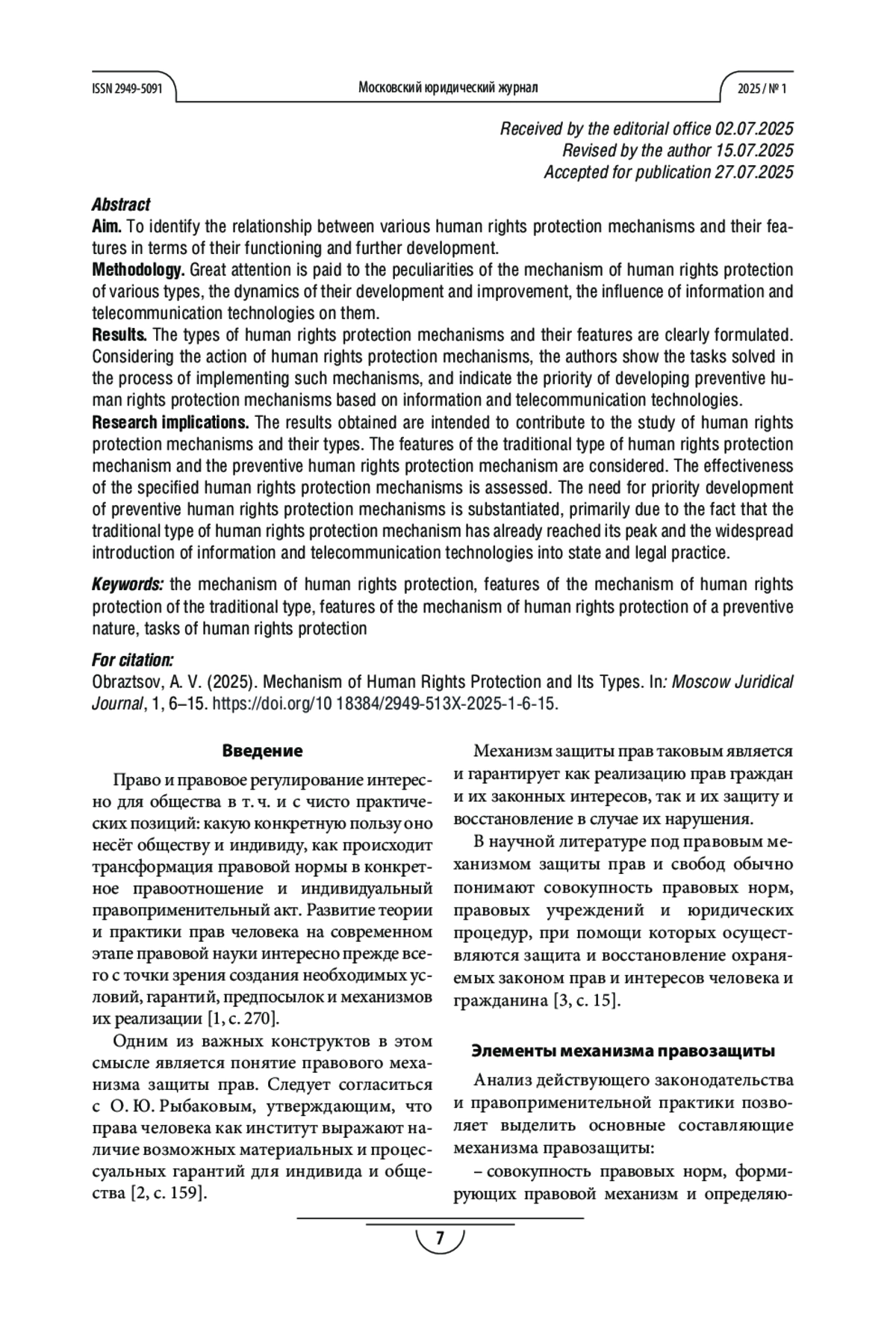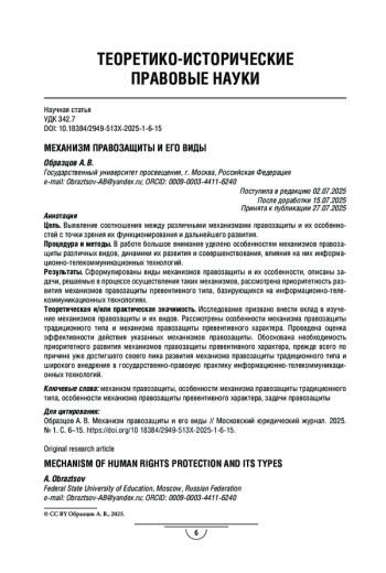 ОБРАЗЦОВ А. В. МЕХАНИЗМ ПРАВОЗАЩИТЫ И ЕГО ВИДЫ // МОСКОВСКИЙ ЮРИДИЧЕСКИЙ ЖУРНАЛ. 2025. 2025 / №1