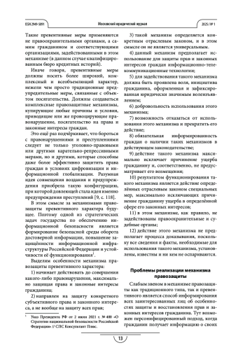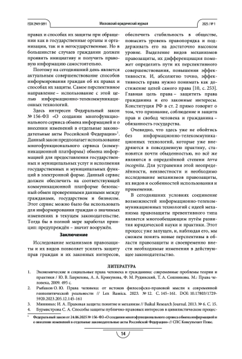 Результаты. Сформулированы виды механизмов правозащиты и их особенности, описаны задачи, решаемые в процессе осуществления таких механизмов, рассмотрена приоритетность развития механизмов правозащиты превентивного типа, базирующихся на информационно-телекоммуникационных технологиях.