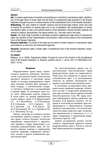 Цель. Анализ подходов учёных и практиков в сфере репродуктивных прав человека, выявление правовой природы данных прав и пределов конституционно-правовой защиты в РФ сквозь призму современной практики Конституционного Суда РФ.