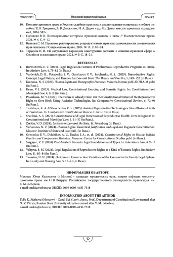 1. Бурмистрова Е. В. Особенности правового регулирования посмертных репродуктивных программ в России // Современное право. 2024. № 4. С. 79-82.