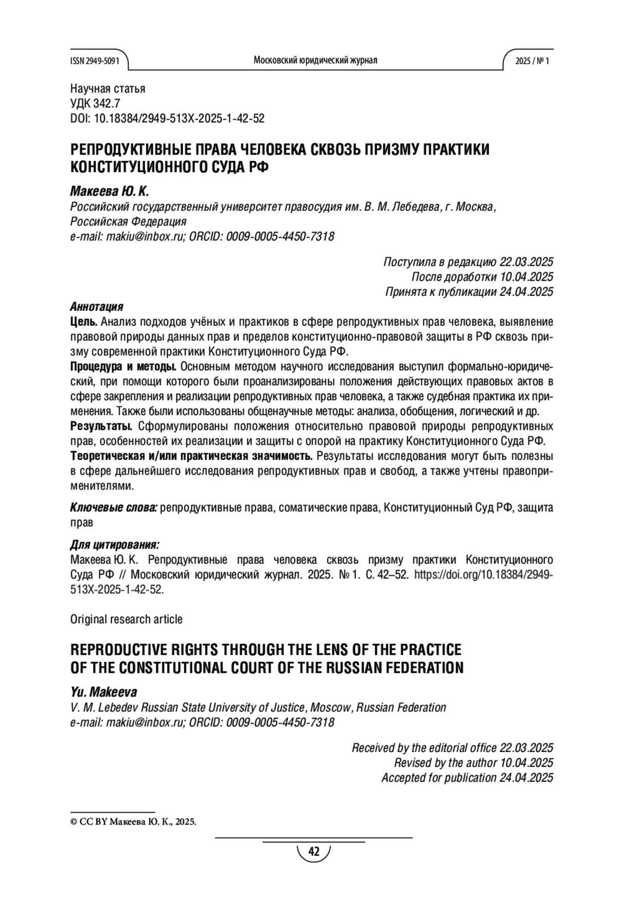 Процедура и методы. Основным методом научного исследования выступил формально-юридический, при помощи которого были проанализированы положения действующих правовых актов в сфере закрепления и реализации репродуктивных прав человека, а также судебная практика их применения. Также были использованы общенаучные методы: анализа, обобщения, логический и др.