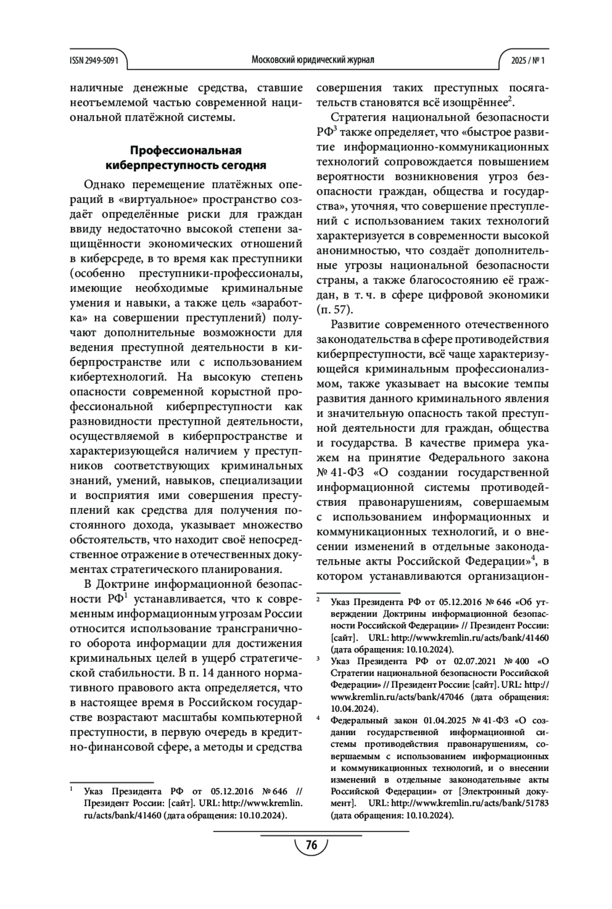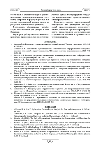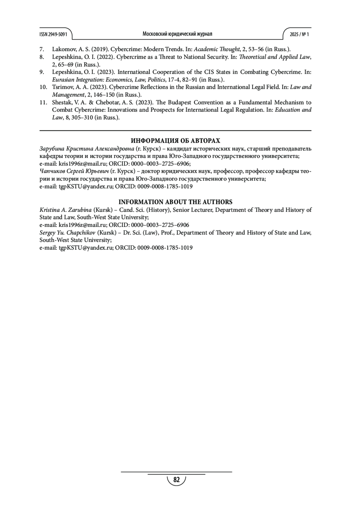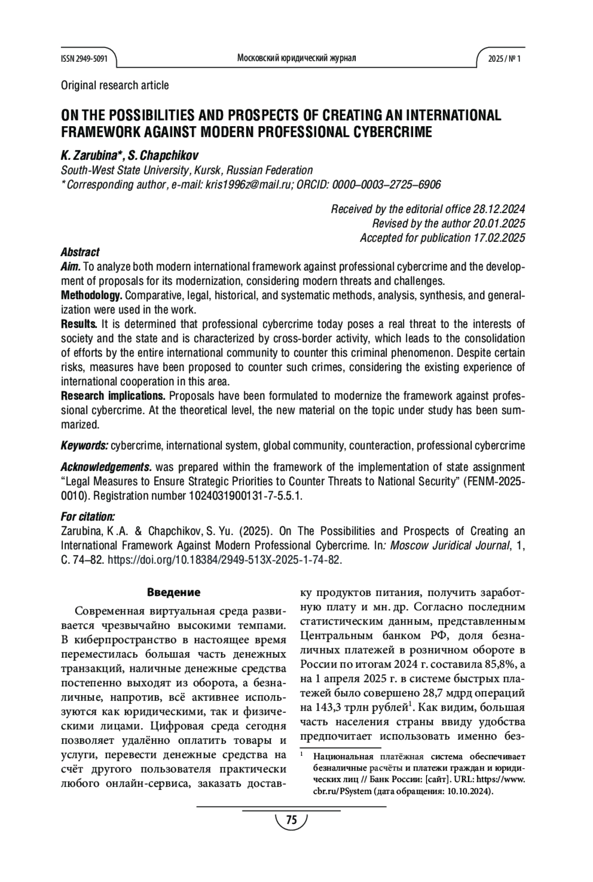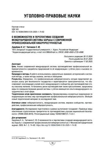 ЗАРУБИНА К. А., ЧАПЧИКОВ С. Ю. О ВОЗМОЖНОСТЯХ И ПЕРСПЕКТИВАХ СОЗДАНИЯ МЕЖДУНАРОДНОЙ СИСТЕМЫ БОРЬБЫ С СОВРЕМЕННОЙ ПРОФЕССИОНАЛЬНОЙ КИБЕРПРЕСТУПНОСТЬЮ // МОСКОВСКИЙ ЮРИДИЧЕСКИЙ ЖУРНАЛ. 2025. 2025 / №1