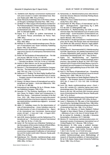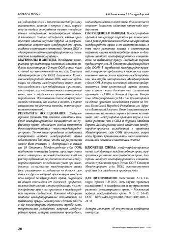 ВВЕДЕНИЕ. Предусмотренная Уставом Организации Объединенных Наций (далее ‒ ООН) обязанность Генеральной Ассамблеи организовывать исследования и делать рекомендации в целях «поощрения прогрессивного развития международного права и его кодификации» выполняется в настоящее время прежде всего посредством сотрудничества государств в формате Комиссии международного права ООН. Вне работы этой Комиссии роль исследований международного права (индивидуальных и коллективных) по-разному оценивается, начиная с вопроса о том, корректно ли вообще употреблять термин «неофициальная кодификация международного права». В настоящей статье исследуется, каково практическое влияние научных трудов на совершенствование современного международного права, особенно в контексте положений Устава ООН о «доктринах наиболее квалифицированных специалистов по публичному праву». МАТЕРИАЛЫ И МЕТОДЫ. Исходными материалами при подготовке настоящей статьи выбраны комментарии к Уставу ООН, в том числе к такой его неотъемлемой части, как Статут Международного суда ООН, документы Комиссии международного права ООН, научные публикации по общему международному праву, включая исследования о его кодификации и развитии, его истории, как подготовленными отечественными, так и зарубежными правоведами-международниками. Использованы такие общенаучные методы познания, как анализ и синтез, а также специальные юридические методы, включая сравнительно-правовой. РЕЗУЛЬТАТЫ ИССЛЕДОВАНИЯ. Предусмотренное Уставом ООН понятие «доктрины наиболее квалифицированных специалистов по публичному праву» обозначает особый компонент более широкого понятия – «науки международного права». Только лишь проведения исследования конкретного вопроса международного права недостаточно для того, чтобы его результаты можно было отнести к «доктринам» в смысле ст. 38 Статута Международного суда ООН; предложены некоторые базовые характеристики таких «доктрин»: научный (академический) характер публикации результатов такого международно-правового исследования; учет при исследовании системности международного права (т. е. результаты исследования не должны сводиться к фрагментарной презентации конкретного вопроса международного права, вырванной из общего контекста его системы); профессиональные достижения автора публикации по международному праву, их признание в международном научном сообществе. Понятие «доктрины наиболее квалифицированных специалистов по публичному праву», используемое в Уставе ООН и в его комментариях, обозначает, прежде всего, теоретические разработки вопросов международного права, которые выполнены правоведами, индивидуально или в коллективе; это понятие не означает документ, изданный каким-либо государством. ОБСУЖДЕНИЕ И ВЫВОДЫ. В международноправовой литературе отражены различные мнения о роли юридических исследований в развитии международного права и его систематизации, в том числе различные мнения о соотношении терминов «наука международного права» и «доктрины наиболее квалифицированных специалистов по публичному праву» (последний термин предусмотрен ст. 38 Статута Международного суда ООН). В зарубежной международно-правовой литературе предложено, в частности, позитивное описание списка юристов-международников, чьи труды цитирова