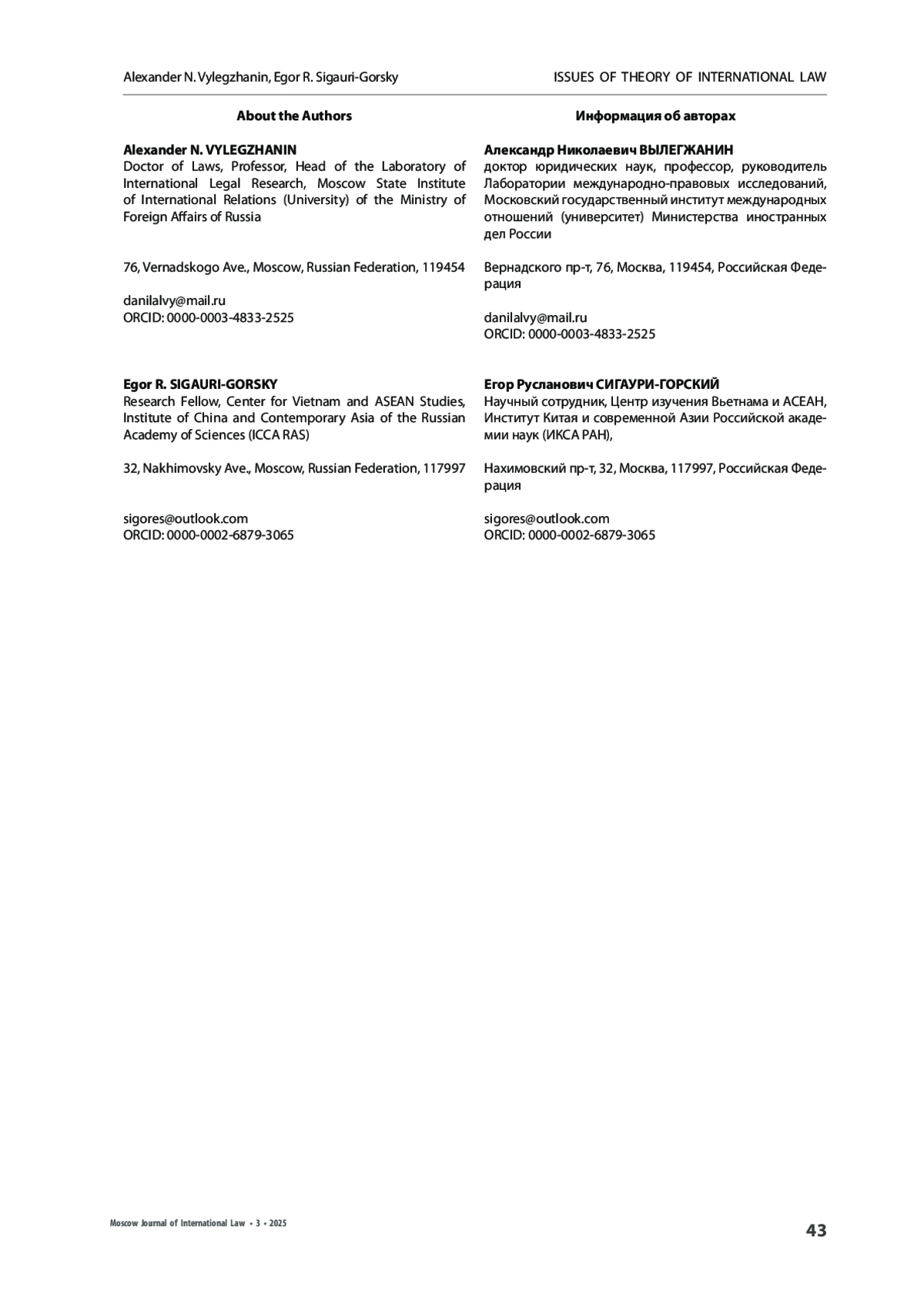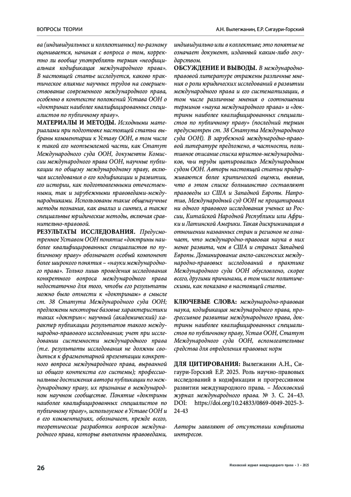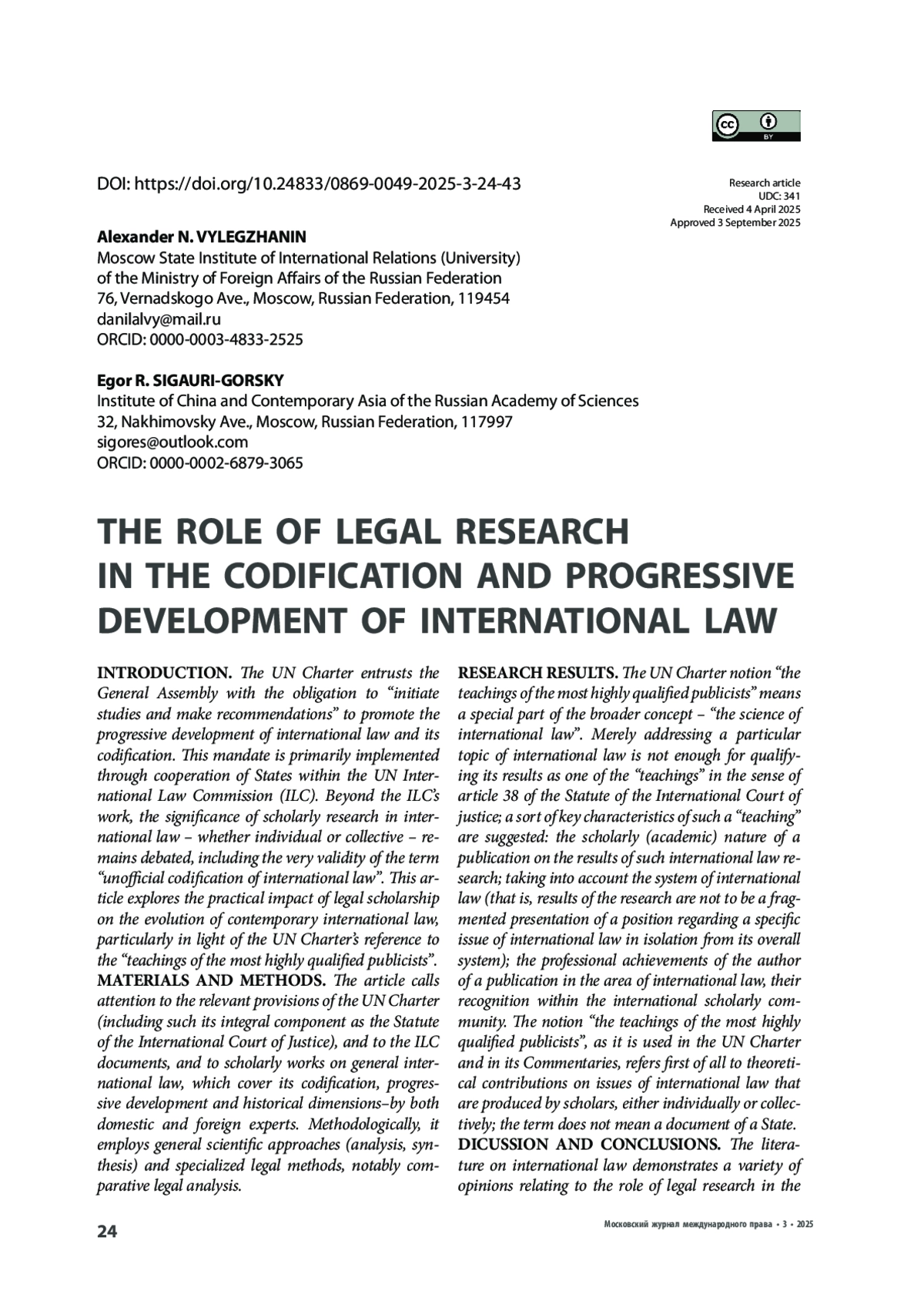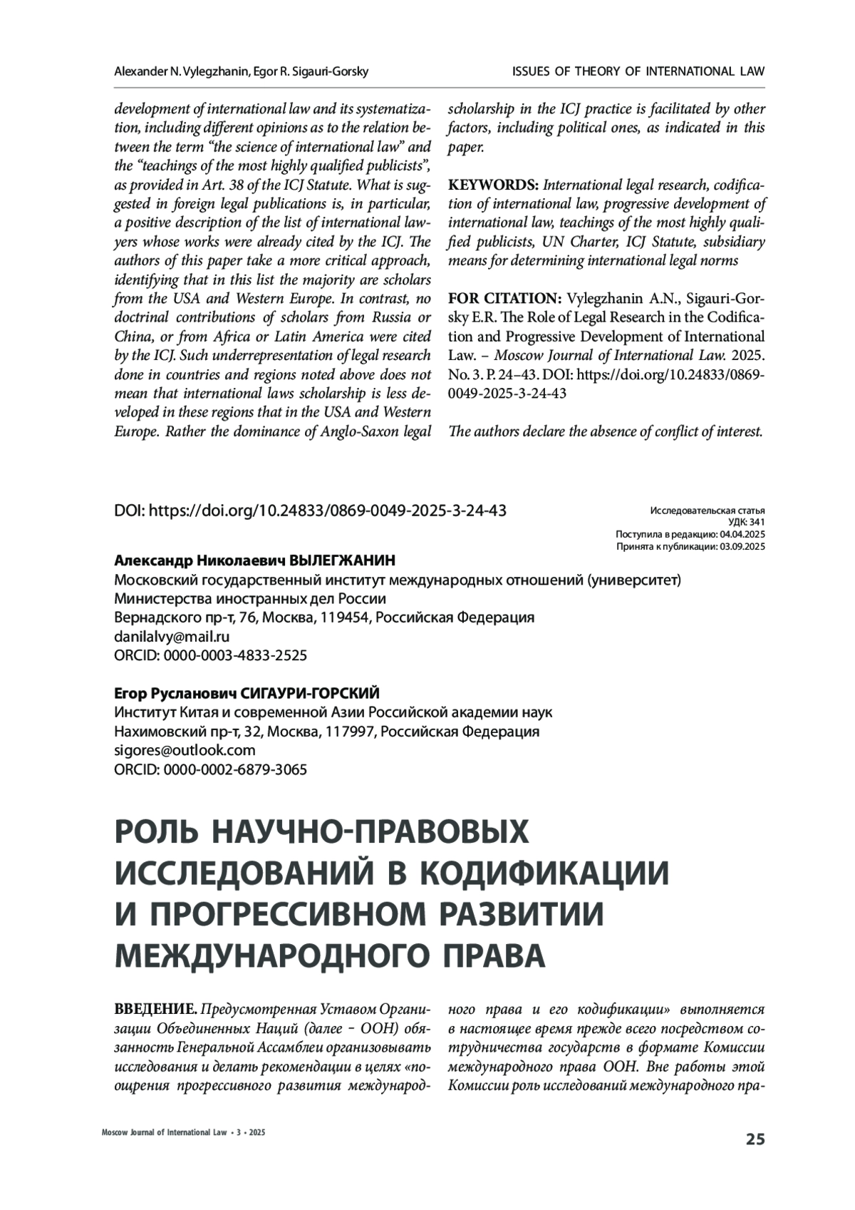 ВЫЛЕГЖАНИН А. Н., СИГАУРИ-ГОРСКИЙ Е. Р. РОЛЬ НАУЧНО-ПРАВОВЫХ ИССЛЕДОВАНИЙ В КОДИФИКАЦИИ И ПРОГРЕССИВНОМ РАЗВИТИИ МЕЖДУНАРОДНОГО ПРАВА // МОСКОВСКИЙ ЖУРНАЛ МЕЖДУНАРОДНОГО ПРАВА. 2025. ВЫПУСК 3