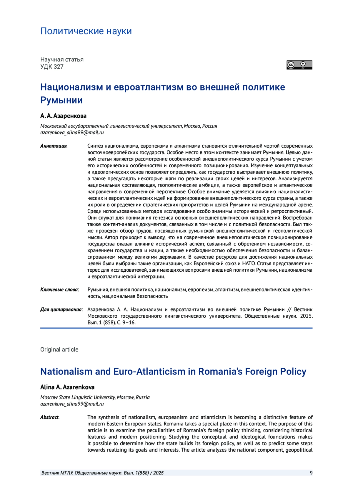 В качестве ресурсов для достижения национальных целей были выбраны такие организации, как Европейский союз и НАТО. Статья представляет интерес для исследователей, занимающихся вопросами внешней политики Румынии, национализма и евроатлантической интеграции.
