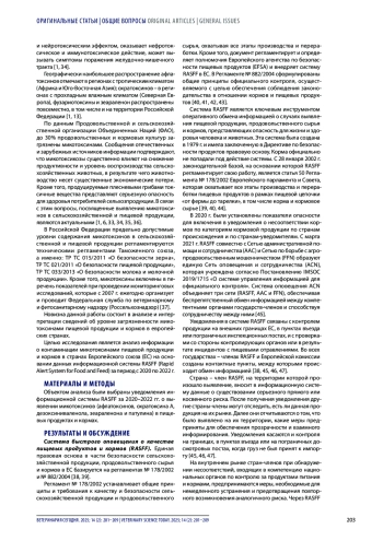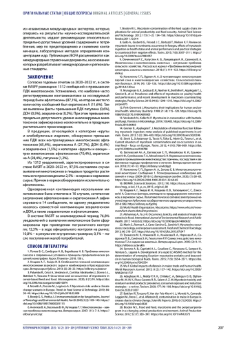 Заключение. Согласно отчетам RASFF и ACN за 2020–2022 гг., микотоксины представляли третью по распространенности категорию опасности. Нарушение законодательства в части превышения предельно допустимых концентраций микотоксинов выявлено исключительно в продукции растительного происхождения.