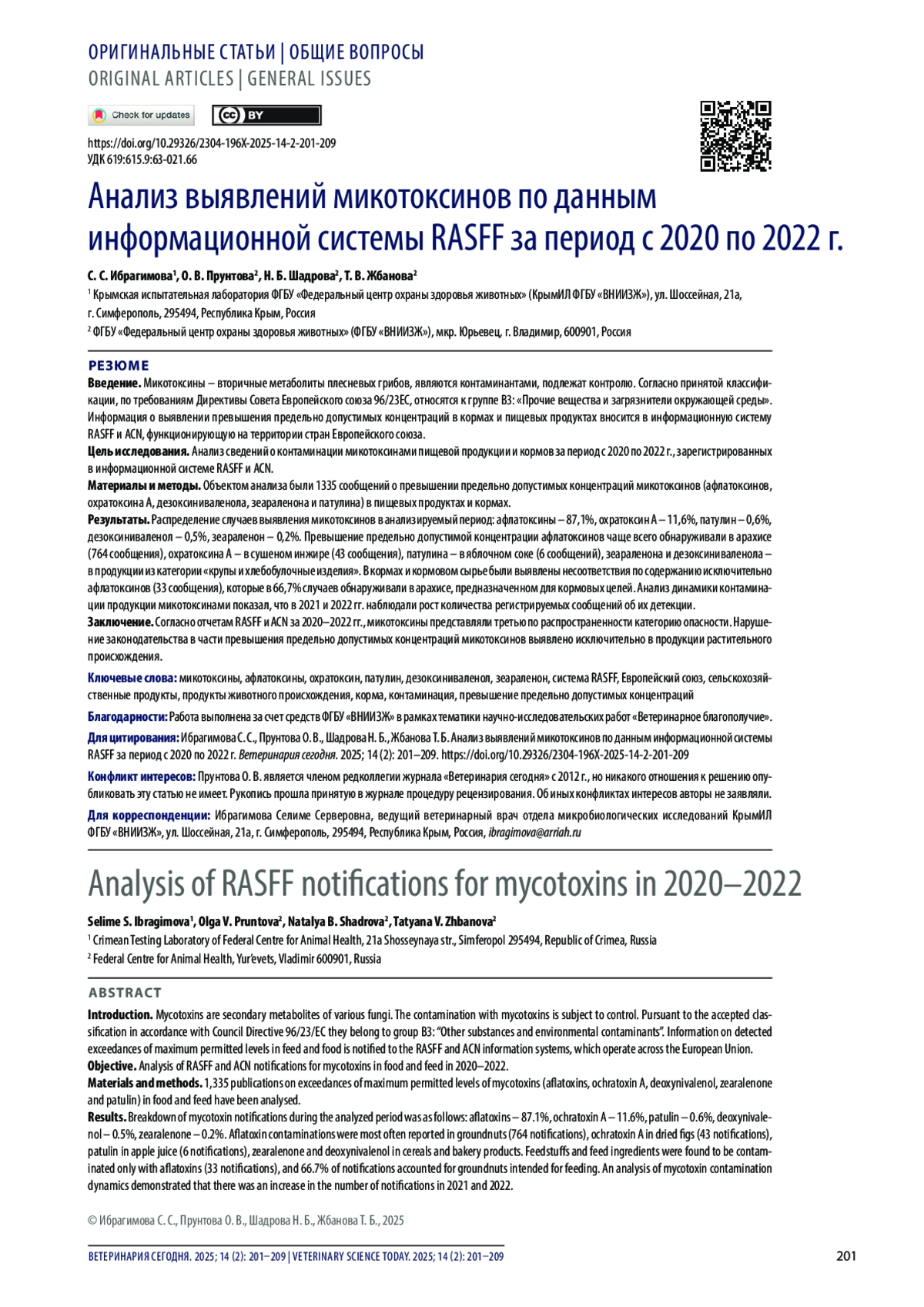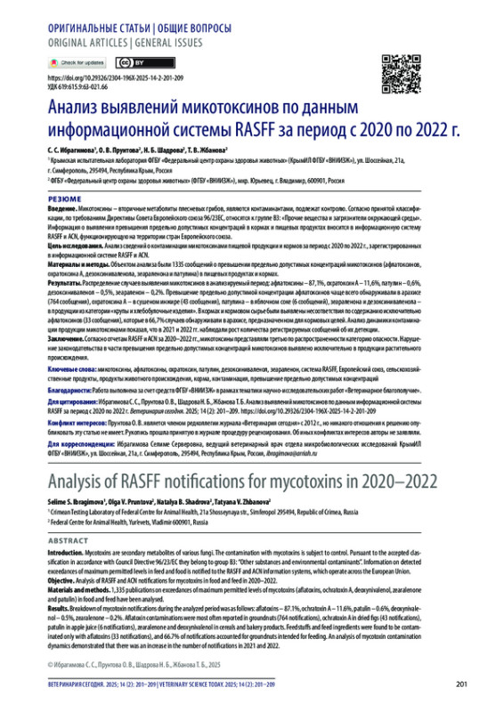 Введение. Микотоксины – вторичные метаболиты плесневых грибов, являются контаминантами, подлежат контролю. Согласно принятой классификации, по требованиям Директивы Совета Европейского союза 96/23ЕС, относятся к группе В3: «Прочие вещества и загрязнители окружающей среды». Информация о выявлении превышения предельно допустимых концентраций в кормах и пищевых продуктах вносится в информационную систему RASFF и ACN, функционирующую на территории стран Европейского союза.