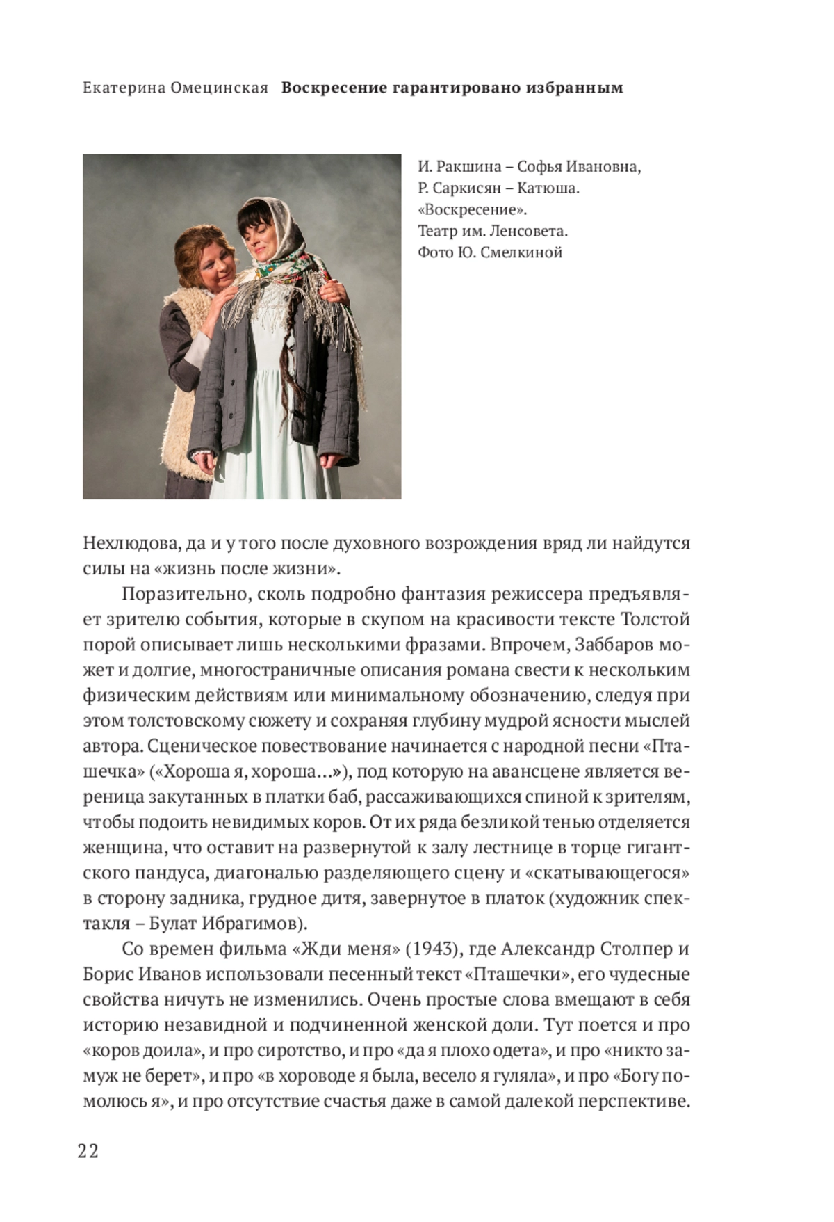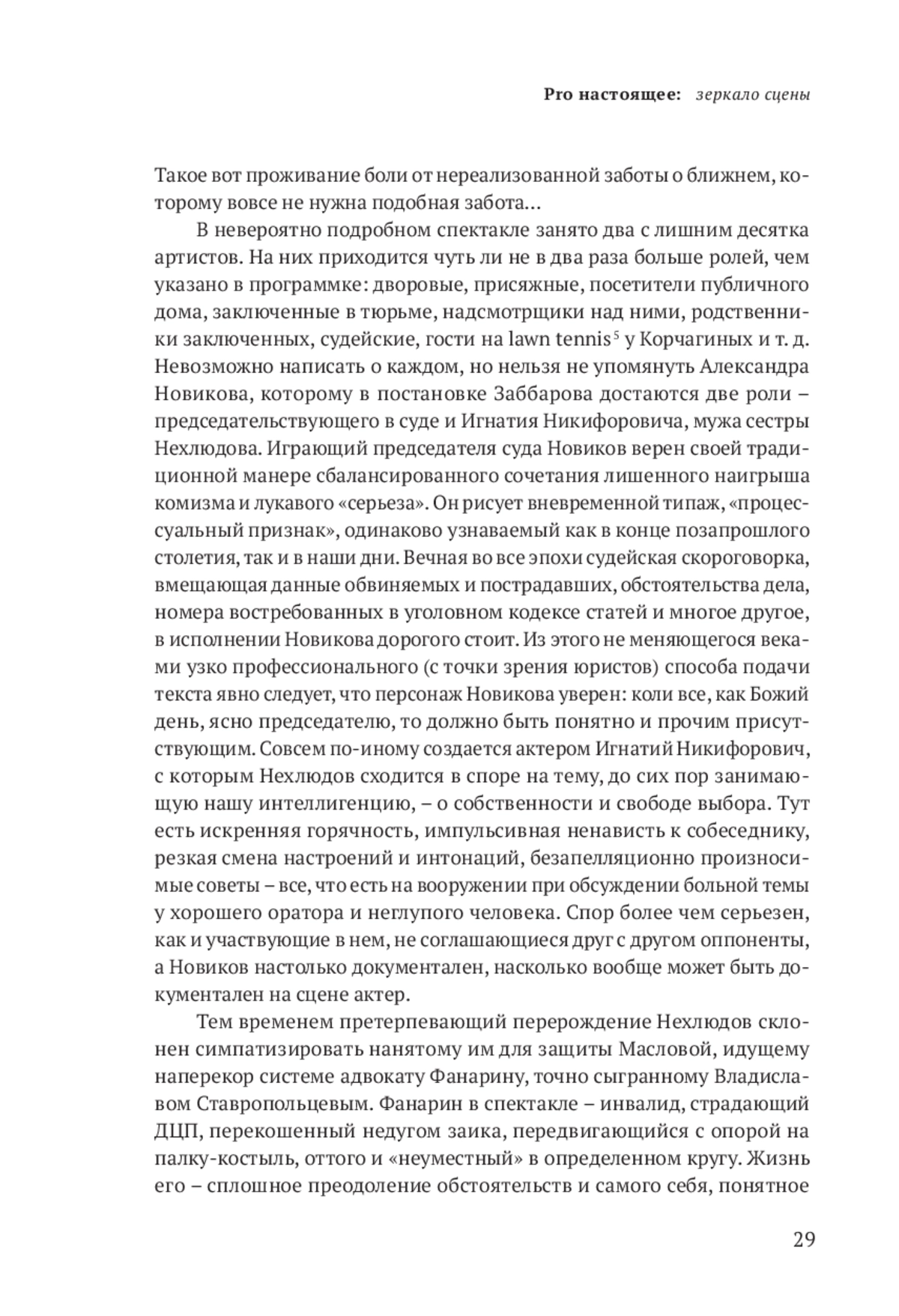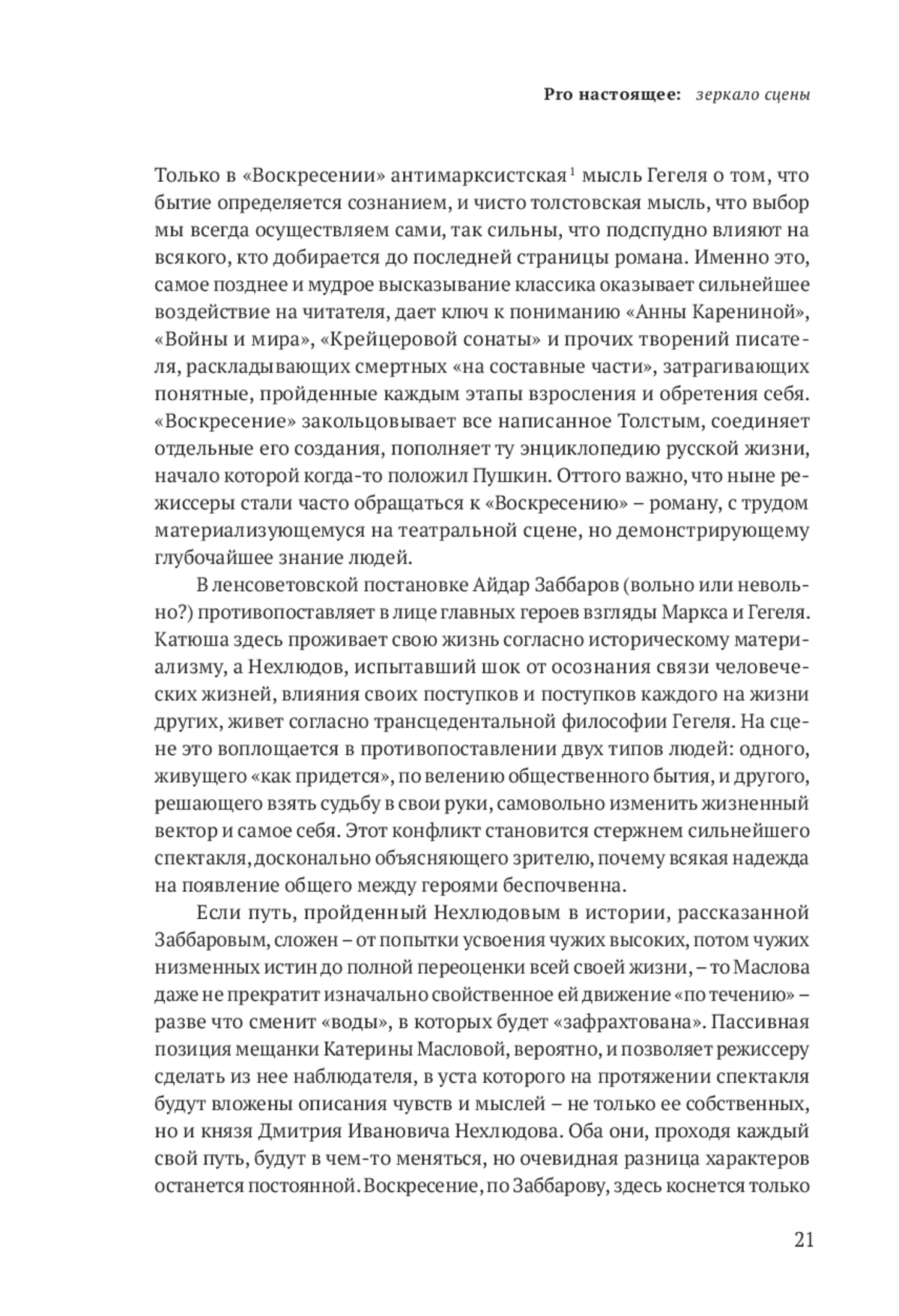Только в «Воскресении» антимарксистская 1 мысль Гегеля о том, что бытие определяется сознанием, и чисто толстовская мысль, что выбор мы всегда осуществляем сами, так сильны, что подспудно влияют на всякого, кто добирается до последней страницы романа. Именно это, самое позднее и мудрое высказывание классика оказывает сильнейшее воздействие на читателя, дает ключ к пониманию «Анны Карениной», «Войны и мира», «Крейцеровой сонаты» и прочих творений писателя, раскладывающих смертных «на составные части», затрагивающих понятные, пройденные каждым этапы взросления и обретения себя. «Воскресение» закольцовывает все написанное Толстым, соединяет отдельные его создания, пополняет ту энциклопедию русской жизни, начало которой когда-то положил Пушкин. Оттого важно, что ныне режиссеры стали часто обращаться к «Воскресению» – роману, с трудом материализующемуся на театральной сцене, но демонстрирующему глубочайшее знание людей.