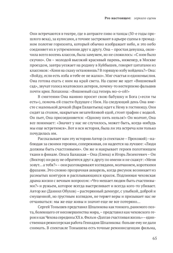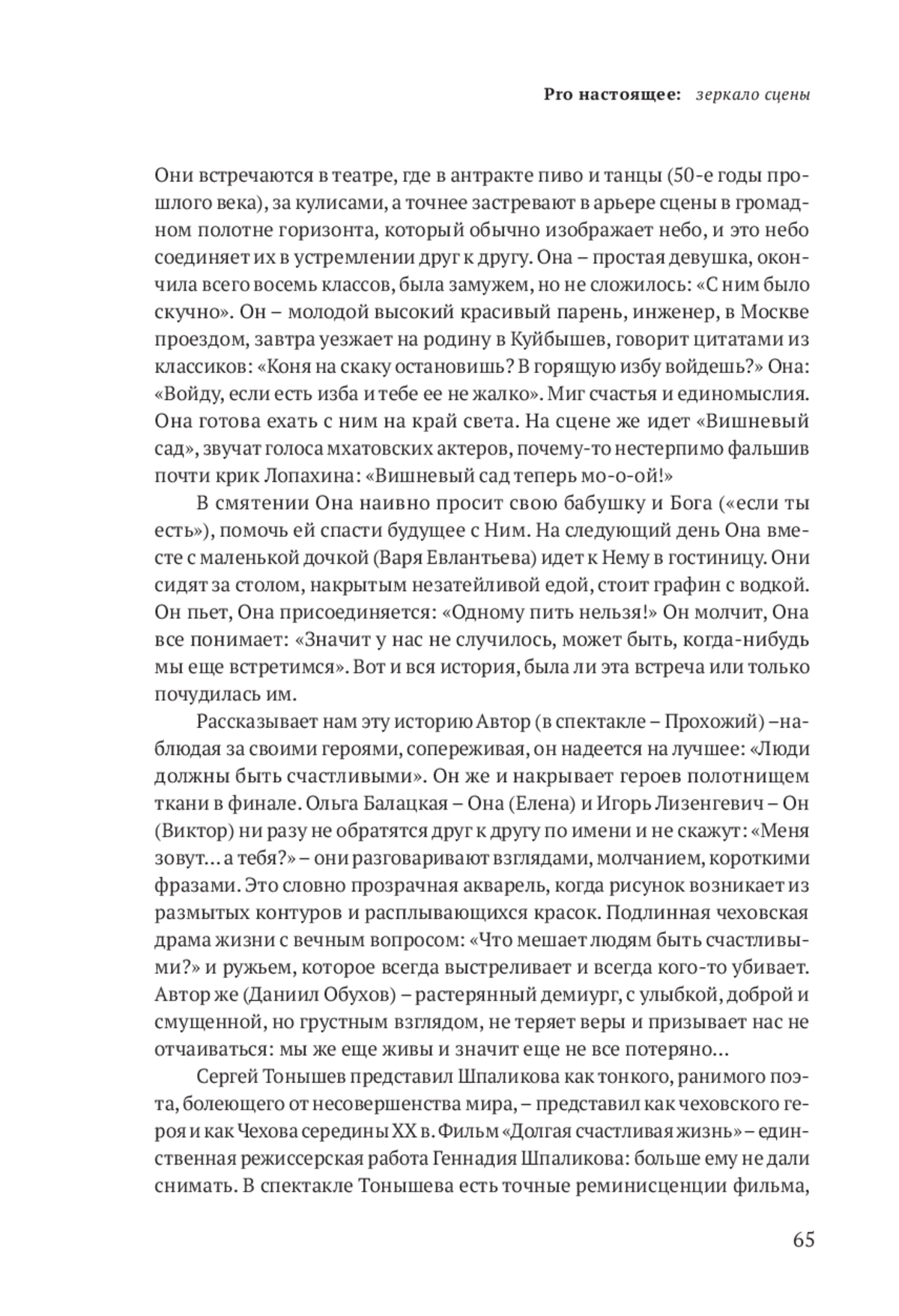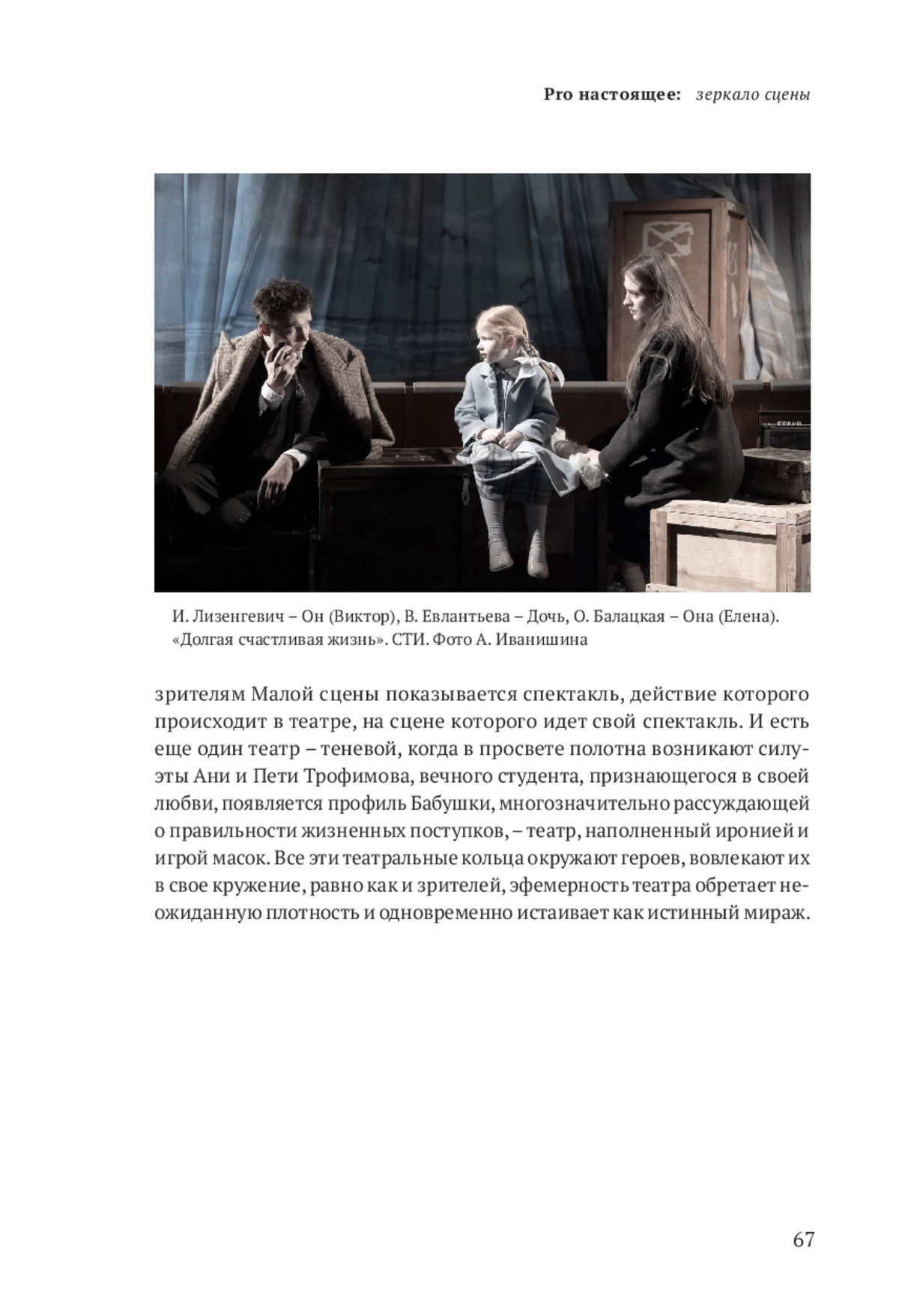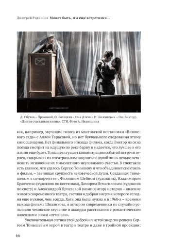 «Долгая счастливая жизнь» – премьера в СТИ. Режиссер и автор сценария Сергей Тонышев назвал постановку миражом по одноименному сценарию и прозе Г. Ф. Шпаликова. В небольшом зале, но двусветном, т. е. с большой высотой, отчего пространство при всей камерности воспринимается просторным, всего около 30 зрительских мест. Интимная близость к происходящему здесь важна и необходима: слишком хрупка и тонка история встречи Его и Ее.