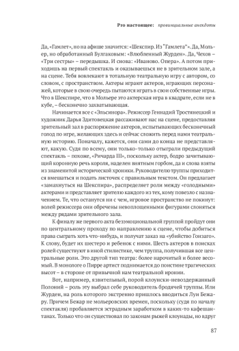 Да, «Гамлет», но на афише значится: «Шекспир. Из “Гамлетаˮ». Да, Мольер, но обработанный Булгаковым: «Влюбленный Журден». Да, Чехов – «Три сестры» – передышка. И снова: «Иваново. Опера». А потом приходишь на первый спектакль и оказываешься не в зрительном зале, а на сцене. Тебя вовлекают в тотальную театральную игру с автором, со словом, с пространством. Актеры играют актеров, играющих персонажей, которые в свою очередь пытаются играть в свои собственные игры. Что в Шекспире, что в Мольере это актерская игра в квадрате, если не в кубе, – бесконечно захватывающая.