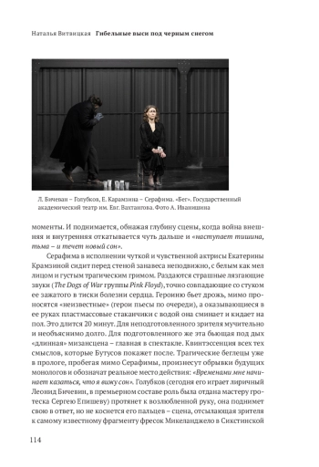 «Бег» – спектакль, исполненный энергетической мощи и живописной выразительности. Бутусов поднимается в нем до высот философского осмысления действительности. Его не слишком заботят политические катаклизмы и тем более переклички с сегодняшним днем. Фразу Хлудова «Крым сдан» ошибочно рифмуют с современными реалиями. Взаимоотношения режиссера с пьесой гораздо сложнее. Бутусов не иллюстрирует и не «обслуживает» сюжет, а ставит спектакль «поверх» первоисточника, сохраняя дистанцию между автором и собой сегодняшним. Пьеса Булгакова для него шире, чем точка отсчета для создания собственного произведения или источник вдохновения, она – его собеседник в разговоре, главной и вечной темой которого является побег от себя и своих собственных травм и кошмаров. «Сновидческая» форма пьесы идеально совпадает с поэтикой режиссера, с его театропониманием и мирочувствованием. Реальность распадается на куски прямо на глазах у зрителя, а горячечный бред героев явлен наглядно и выразительно и рождает широкий спектр ассоциаций и метафор, призванных придать повествованию кардинальное звучание.