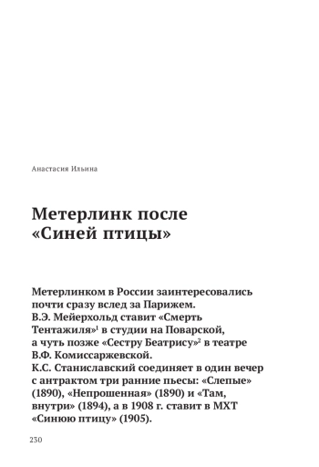 Метерлинком в России заинтересовались почти сразу вслед за Парижем. В. Э. Мейерхольд ставит «Смерть Тентажиля»1 в студии на Поварской, а чуть позже «Сестру Беатрису»2 в театре В. Ф. Комиссаржевской. К. С. Станиславский соединяет в один вечер с антрактом три ранние пьесы: «Слепые» (1890), «Непрошенная» (1890) и «Там, внутри» (1894), а в 1908 г. ставит в МХТ «Синюю птицу» (1905).