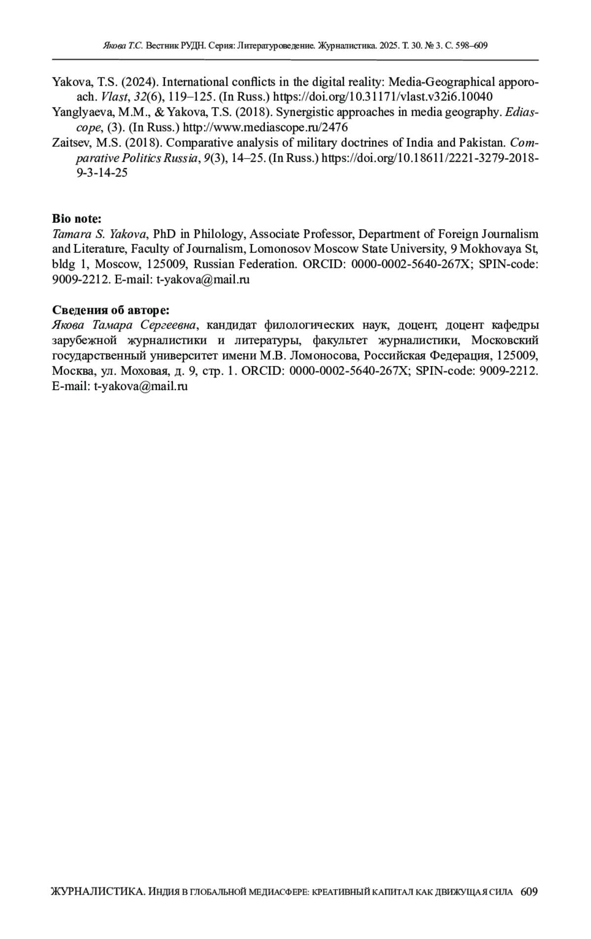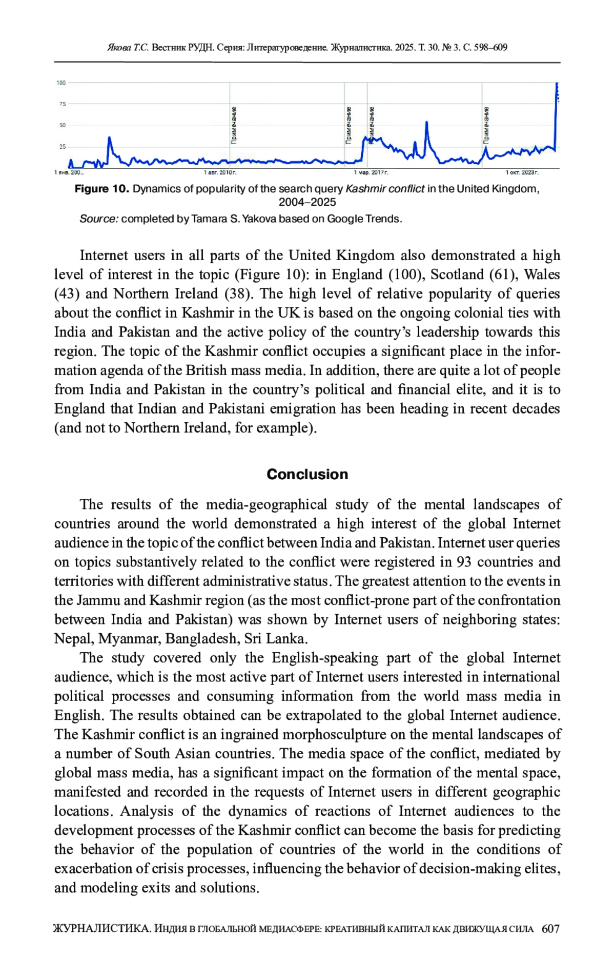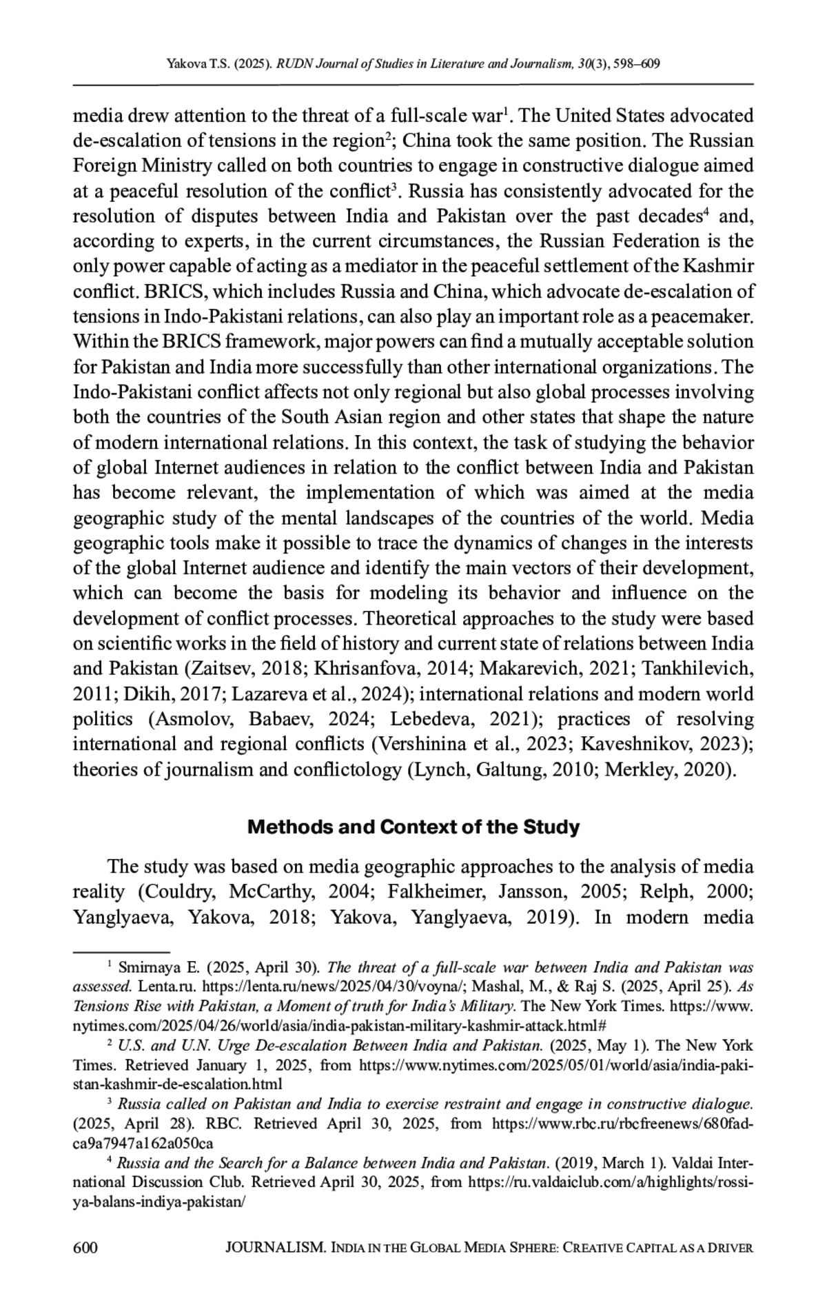 ЯКОВА Т. С. КОНФЛИКТ ИНДИИ И ПАКИСТАНА НА ГЛОБАЛЬНОМ МЕНТАЛЬНОМ ЛАНДШАФТЕ: МЕДИАГЕОГРАФИЧЕСКИЙ ФОКУС // ВЕСТНИК РОССИЙСКОГО УНИВЕРСИТЕТА ДРУЖБЫ НАРОДОВ. СЕРИЯ: ЛИТЕРАТУРОВЕДЕНИЕ. ЖУРНАЛИСТИКА. 2025. ТОМ 30 № 3