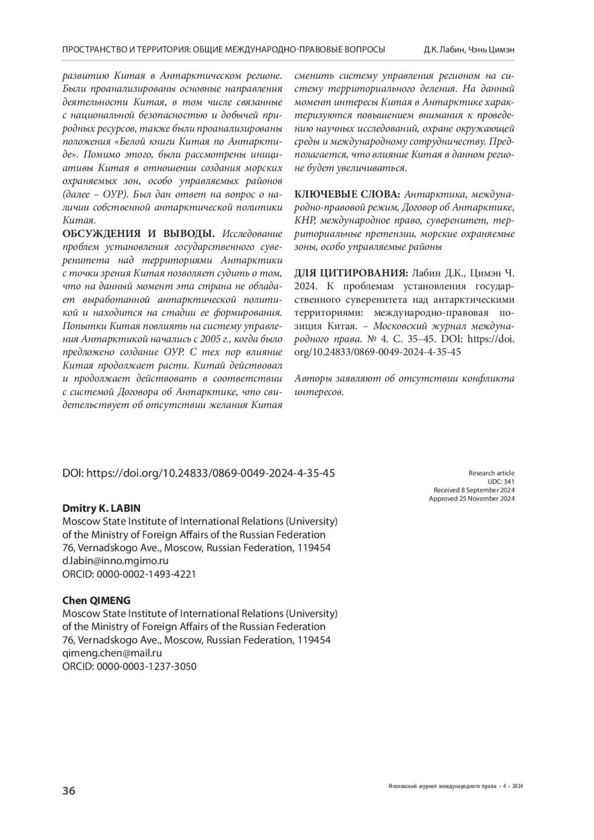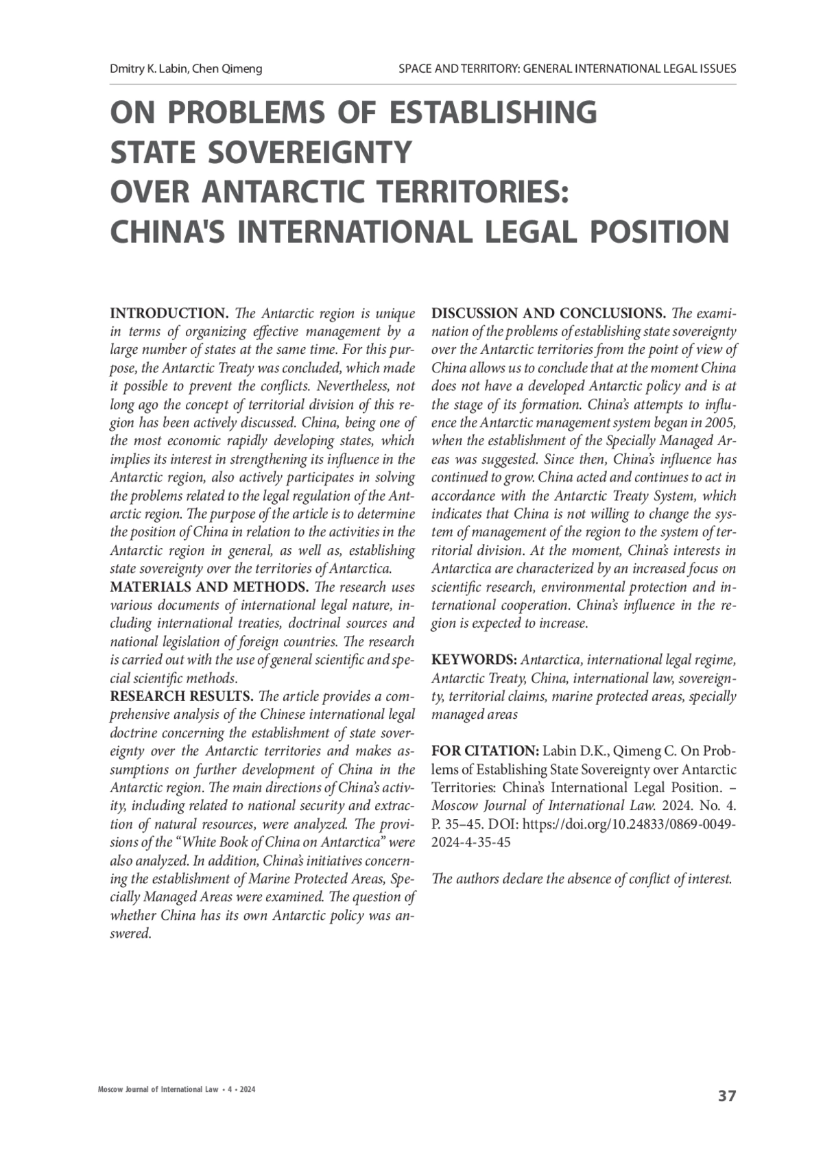 РЕЗУЛЬТАТЫ ИССЛЕДОВАНИЯ. В статье проведен комплексный анализ китайской международно-правовой доктрины в отношении установления государственного суверенитета над территориями Антарктики, а также сформулированы предположения по дальнейшему развитию Китая в Антарктическом регионе. Были проанализированы основные направления деятельности Китая, в том числе связанные с национальной безопасностью и добычей природных ресурсов, также были проанализированы положения «Белой книги Китая по Антарктиде». Помимо этого, были рассмотрены инициативы Китая в отношении создания морских охраняемых зон, особо управляемых районов (далее – ОУР). Был дан ответ на вопрос о наличии собственной антарктической политики Китая.