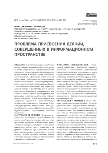 ВВЕДЕНИЕ. В основе настоящего исследования лежит проблема присвоения ответственности за деяния, совершенные в информационном пространстве. Ее актуальность обуславливается наметившейся в последнее время тенденцией, заключающейся в применении отдельными государствами информационно-коммуникационных технологий (далее – ИКТ) для утверждения своего геополитического превосходства. Вместе с тем остаются открытыми как вопрос присвоения подобных распространенных деяний, так и вопрос дальнейшего реагирования на них. В связи с этим в статье анализируются теоретические аспекты международно-правовой ответственности, в том числе вопросы единообразного применения соответствующей терминологии, особенности присвоения деяния в информационном пространстве. Также рассматривается вопрос эффективности международно-правового регулирования указанной тематики.
