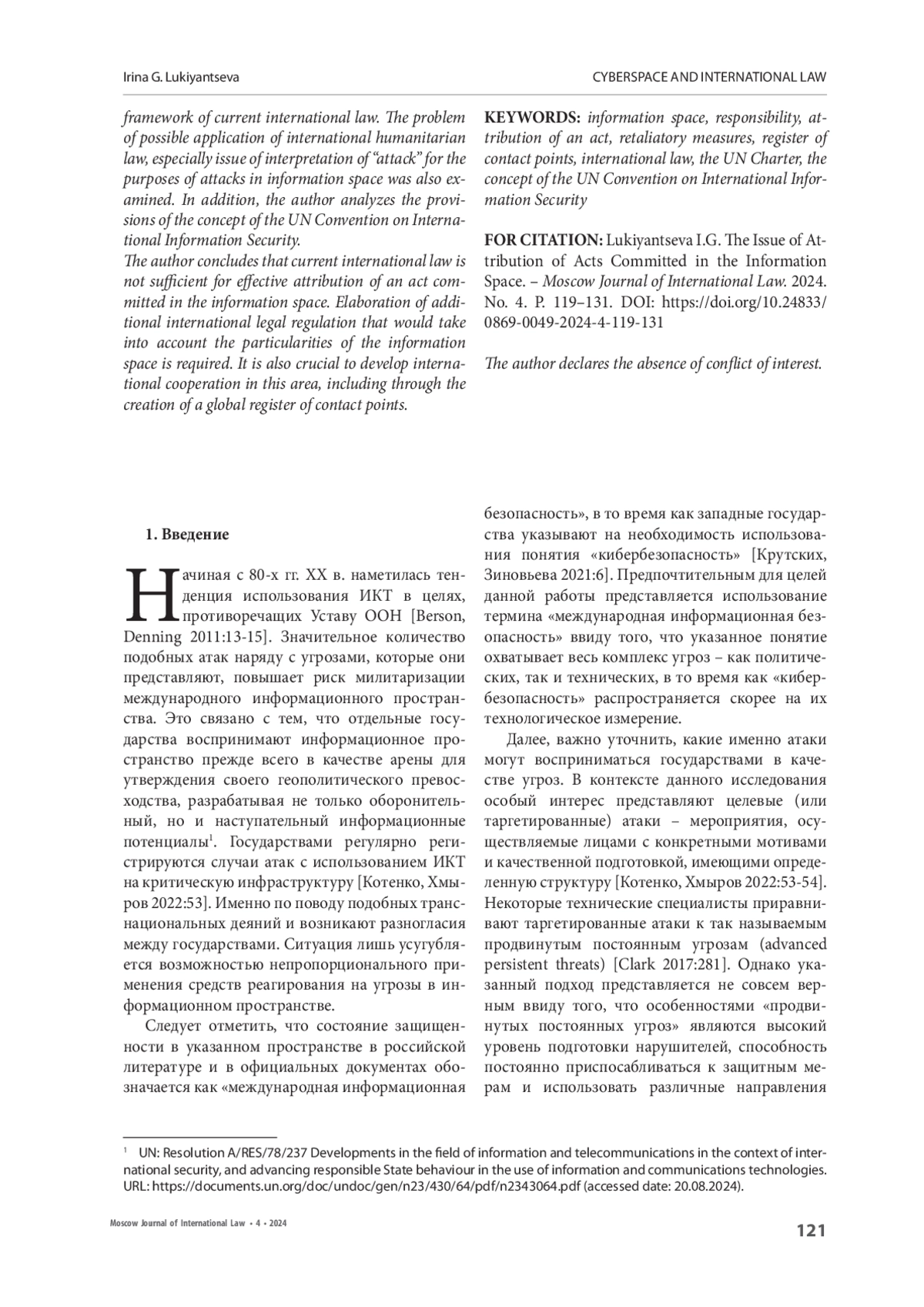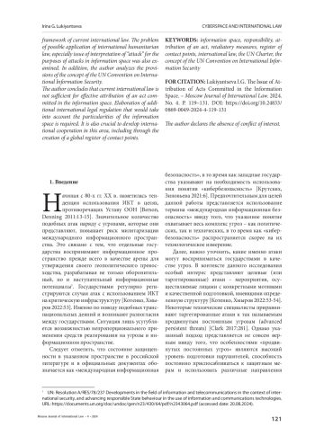 ОБСУЖДЕНИЯ И ВЫВОДЫ. В статье проведен комплексный анализ подходов к проблеме присвоения атак в информационном пространстве, а также способов реагирования на них в соответствии с действующим международным правом. Рассматриваются конкретные инициативы государств на международных площадках, а также позиции технических специалистов и политологов по данному вопросу. Помимо этого, автор проводит анализ положений концепции Конвенции ООН об обеспечении международной информационной безопасности. Сделан вывод, что вопрос присвоения деяния, совершенного в информационном пространстве, требует разработки дополнительного международно-правового регулирования, которое будет учитывать особенности информационного пространства. Также представляется важным развитие международного сотрудничества в данной области, в том числе через создание глобального реестра контактных пунктов.