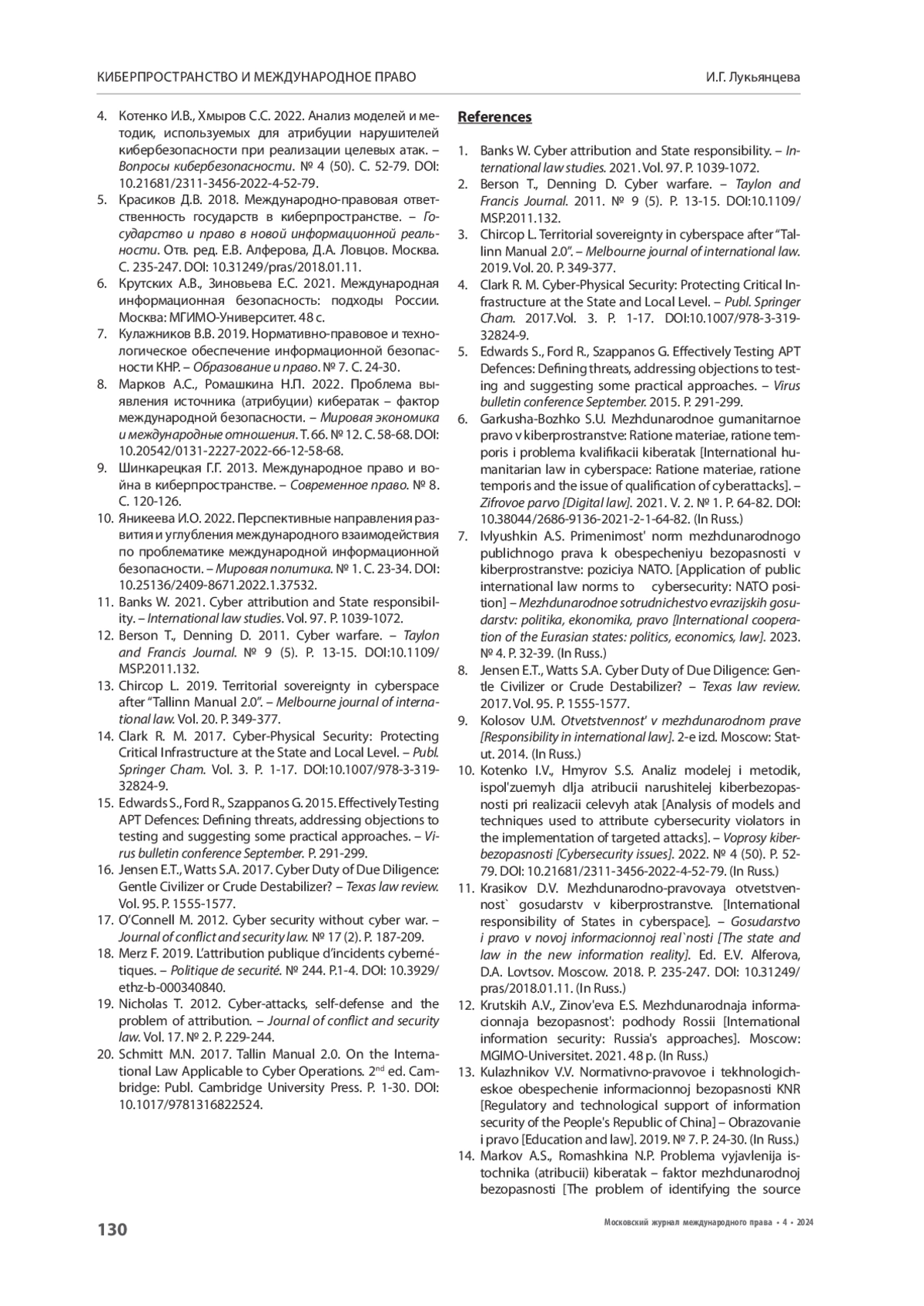 5. Красиков Д.В. 2018. Международно-правовая ответственность государств в киберпространстве. - Государство и право в новой информационной реальности. Отв. ред. Е.В. Алферова, Д.А. Ловцов. Москва. С. 235-247. https://doi.org/10.31249/pras/2018.01.11.