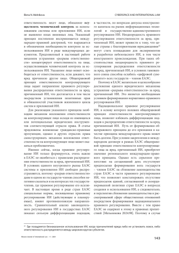 ВЫВОДЫ. При условии закрепления в международном договоре в рамках ЕАЭС общеправовой принцип ответственности контролирующего лица за вред, причиненный ИИ, может приобрести значение регионального международно-правового принципа, и тем самым стать основой формирования в ЕАЭС нормативно-правового регулирования распределения ответственности за вред, причиненный ИИ. Предложенный юридический механизм пригоден для сближения законодательств государств – членов ЕАЭС как посредством наднационального правового регулирования, так и посредством гармонизации законодательств по данному вопросу.