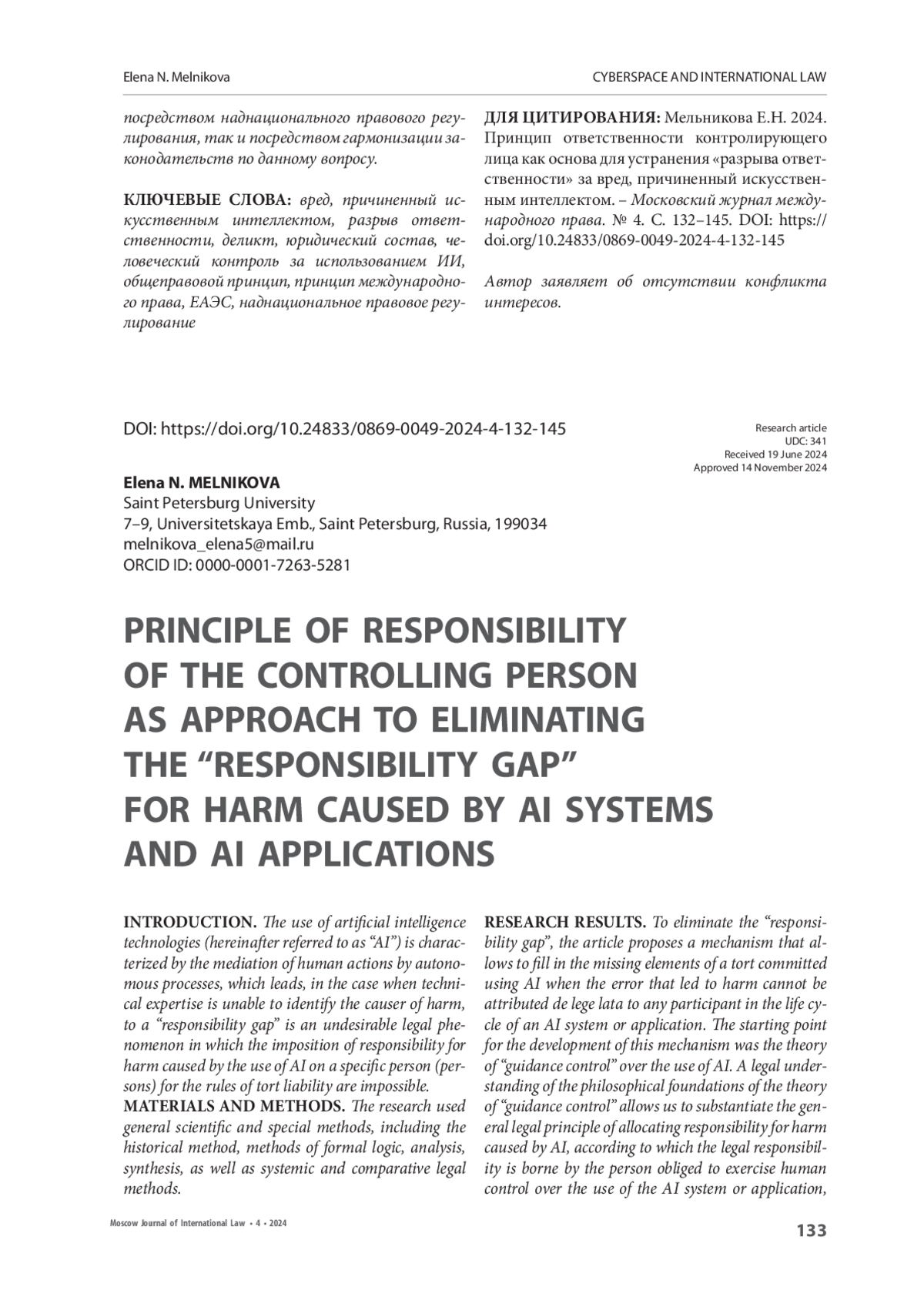 РЕЗУЛЬТАТЫ ИССЛЕДОВАНИЯ. Для устранения «разрыва ответственности» в статье предложен механизм, позволяющий восполнить недостающие элементы состава деликта, совершенного с использованием ИИ тогда, когда ошибку, которая привела к причинению вреда, de lege lata невозможно атрибутировать ни одному участнику жизненного цикла системы или приложения ИИ. Отправной точкой разработки данного механизма стала теория «руководящего контроля» за использованием ИИ. Юридическое осмысление философских оснований теории «руководящего контроля» позволяет обосновать общеправовой принцип распределения ответственности за вред, причиненный ИИ, согласно которому юридическую ответственность несет лицо, обязанное осуществлять человеческий контроль за использованием системы или приложения ИИ, если не выявлено иных виновных лиц. Указанный принцип постепенно воспринимается международно-правовой доктриной, что выражается в обозначении необходимости контроля за использованием ИИ в ряде международных документов.