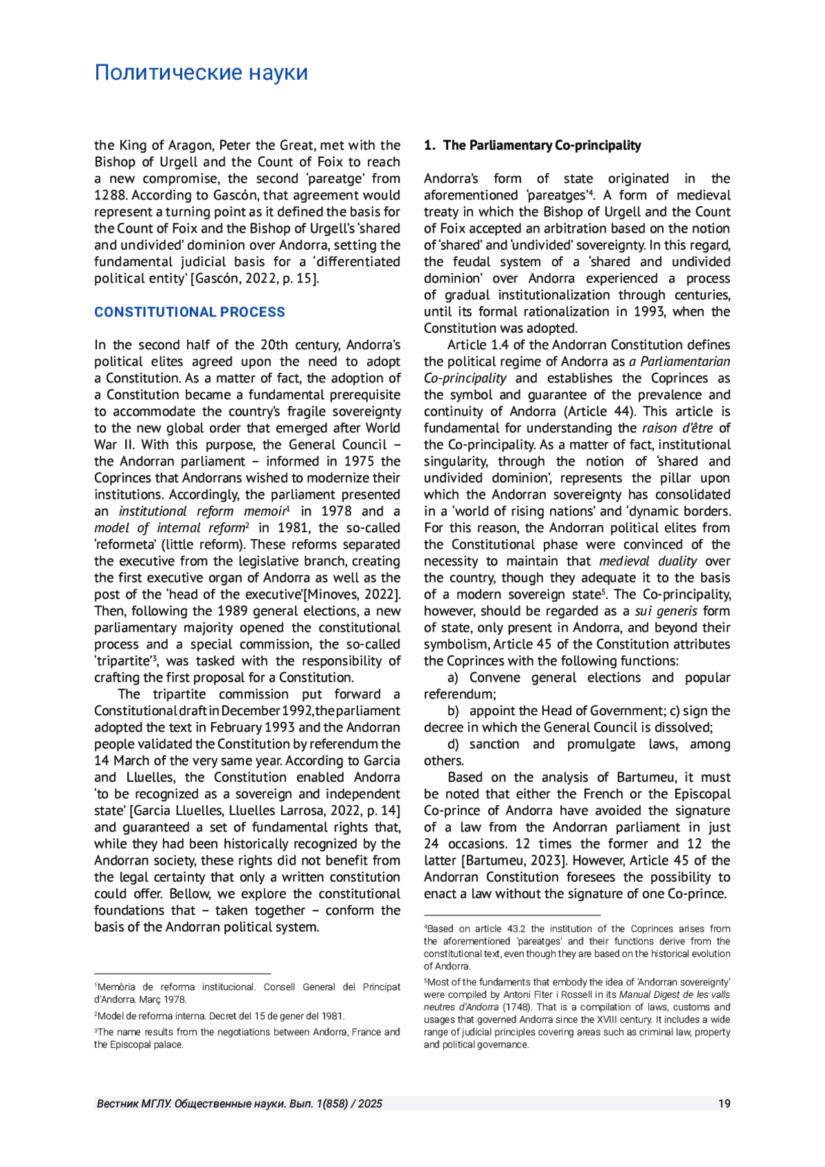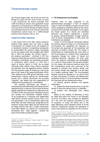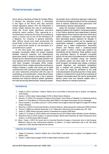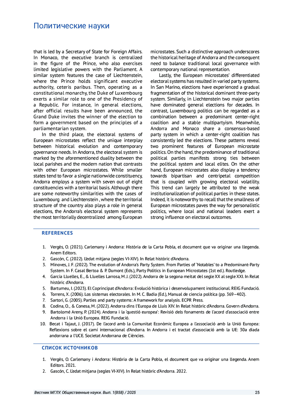 Политическая система Андорры, характеризующаяся парламентской моделью совместного управления княжествами и особой исторической траекторией, представляет собой уникальный пример европейского государственного устройства. Несмотря на свою уникальную институциональную структуру, андоррская модель мало освещена в политологической литературе. Данная статья направлена на устранение этого пробела путем проведения всестороннего анализа политической системы Андорры с акцентом на ее институциональные структуры, историческую эволюцию и современную динамику управления. С использованием историко-институционального подхода в исследовании рассматривается трансформация политической системы Андорры от ее средневековых образцов до принятия Конституции в 1993 году, которая официально закрепила ее статус суверенной парламентской демократии. В исследовании рассматривается роль ключевых институтов, включая Генеральный совет, избирательную систему и развитие политических партий. Параллельно рассматривается влияние внешних факторов, в частности, развитие отношений Андорры с Европейским союзом. С этой целью в документе используется подход сравнительной политологии, сравнивающий структуру управления Андорры с другими европейскими микрогосударствами, такими как Монако, Сан-Марино, Лихтенштейн и Люксембург. Этот методологический подход позволяет оценить институциональную адаптируемость Андорры, ее демократическую консолидацию и международное положение. Анализ правовой, политической и территориальной организации Андорры в данном исследовании способствует пониманию управления малыми государствами и динамики суверенитета в современной Европе. Результаты исследования подчеркивают институциональную устойчивость Андорры и ее способность сочетать историческую преемственность с современными политическими преобразованиями, предлагая ценную информацию ученым в области сравнительной политологии, конституционного права и европейской интеграции.