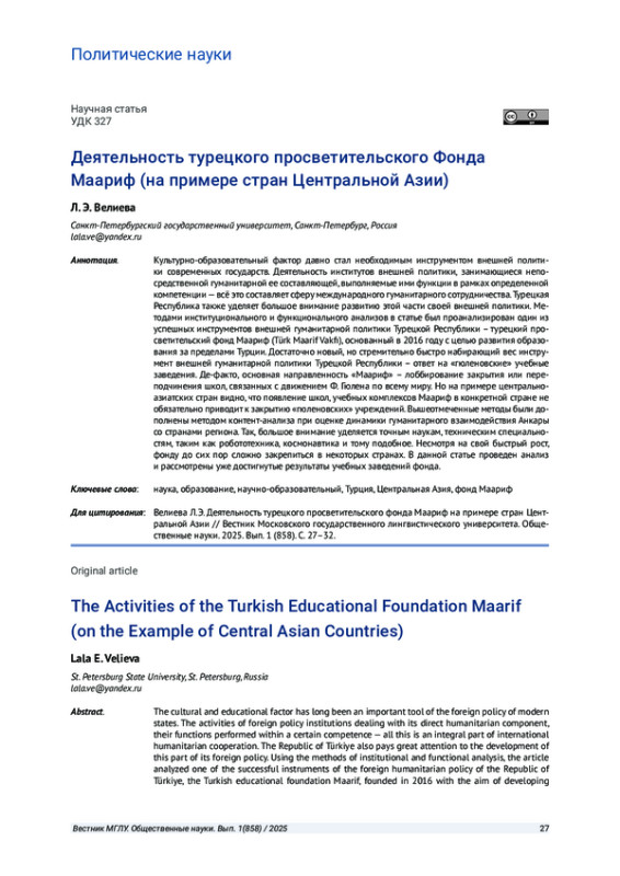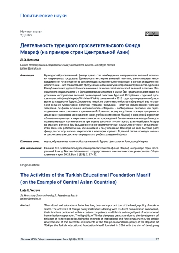 Культурно-образовательный фактор давно стал необходимым инструментом внешней политики современных государств. Деятельность институтов внешней политики, занимающиеся непосредственной гуманитарной ее составляющей, выполняемые ими функции в рамках определенной компетенции - всё это составляет сферу международного гуманитарного сотрудничества. Турецкая Республика также уделяет большое внимание развитию этой части своей внешней политики. Методами институционального и функционального анализов в статье был проанализирован один из успешных инструментов внешней гуманитарной политики Турецкой Республики - турецкий просветительский фонд Маариф (Türk Maarif Vakfı), основанный в 2016 году с целью развития образования за пределами Турции. Достаточно новый, но стремительно быстро набирающий вес инструмент внешней гуманитарной политики Турецкой Республики - ответ на «гюленовские» учебные заведения. Де-факто, основная направленность «Маариф» - лоббирование закрытия или переподчинения школ, связанных с движением Ф. Гюлена по всему миру. Но на примере центральноазиатских стран видно, что появление школ, учебных комплексов Маариф в конкретной стране не обязательно приводит к закрытию «гюленовских» учреждений. Вышеотмеченные методы были дополнены методом контент-анализа при оценке динамики гуманитарного взаимодействия Анкары со странами региона. Так, большое внимание уделяется точным наукам, техническим специальностям, таким как робототехника, космонавтика и тому подобное. Несмотря на свой быстрый рост, фонду до сих пор сложно закрепиться в некоторых странах. В данной статье проведен анализ и рассмотрены уже достигнутые результаты учебных заведений фонда.