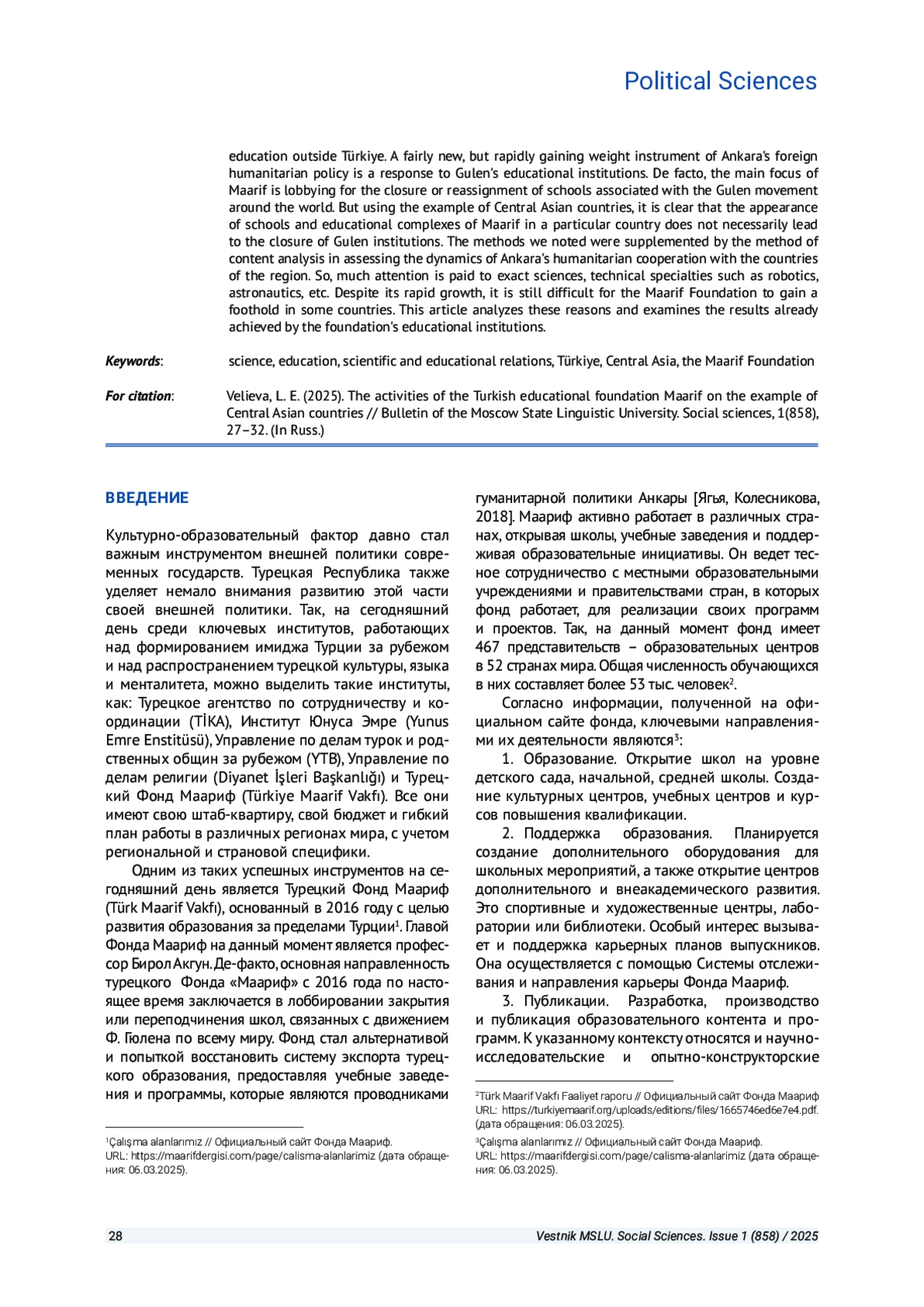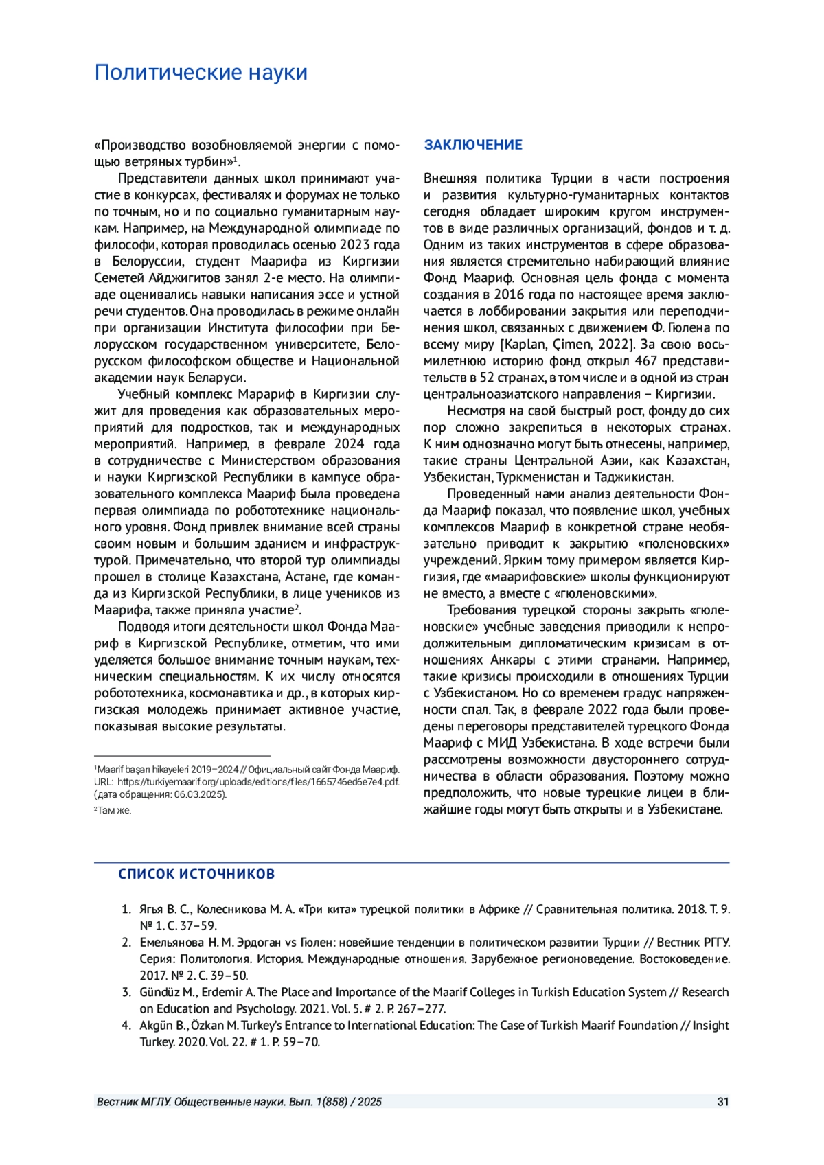 4. Akgün B., Özkan M. Turkey’s Entrance to International Education: The Case of Turkish Maarif Foundation // Insight Turkey. 2020. Vol. 22. # 1. P. 59-70.