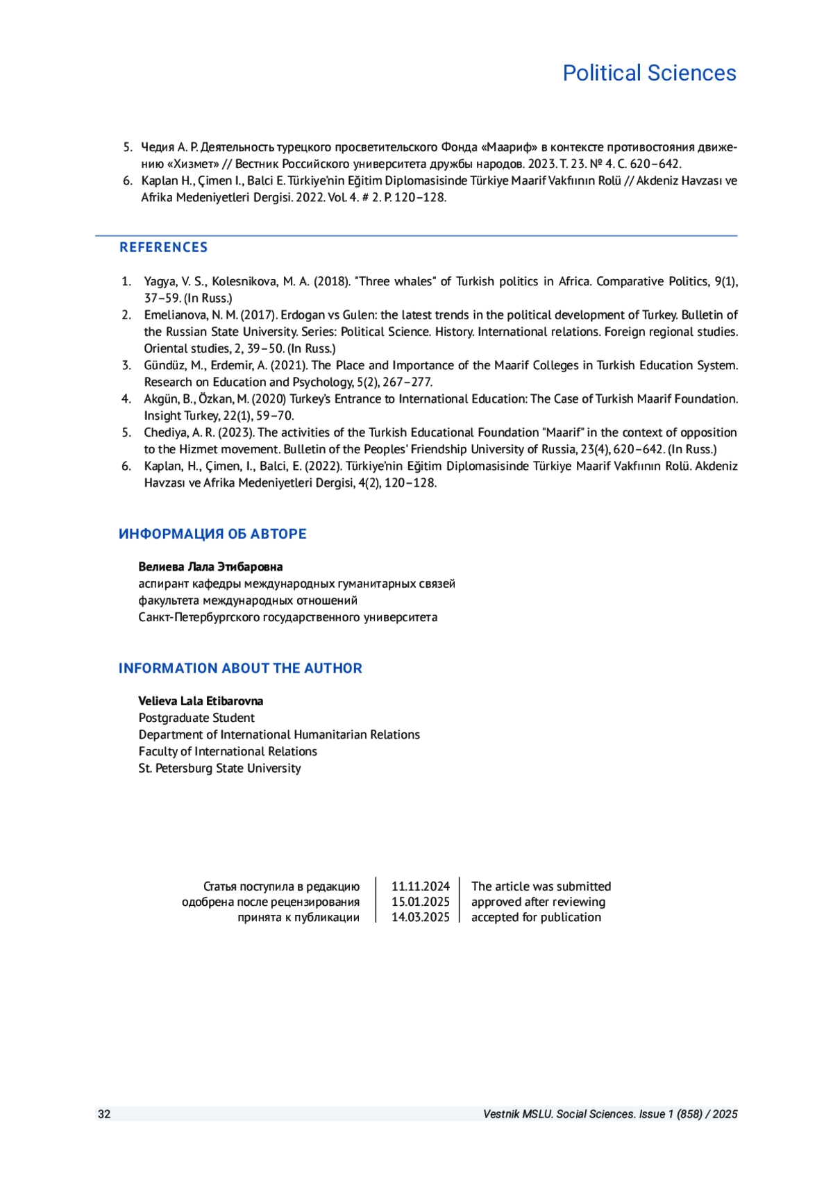 5. Чедия А. Р. Деятельность турецкого просветительского Фонда “Маариф” в контексте противостояния движению “Хизмет” // Вестник Российского университета дружбы народов. 2023. Т. 23. № 4. С. 620-642.