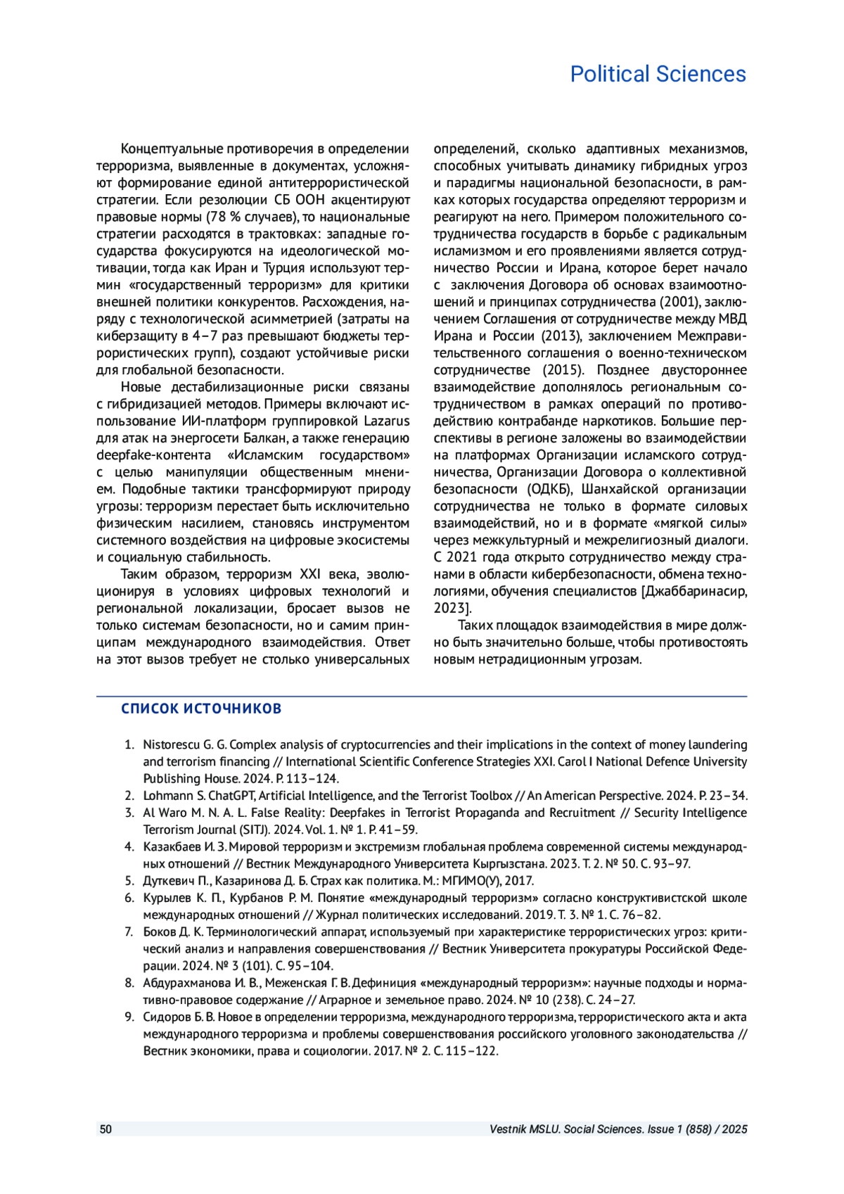 8. Абдурахманова И. В., Меженская Г. В. Дефиниция “международный терроризм”: научные подходы и нормативно-правовое содержание // Аграрное и земельное право. 2024. № 10 (238). С. 24-27. EDN: PUFFOI