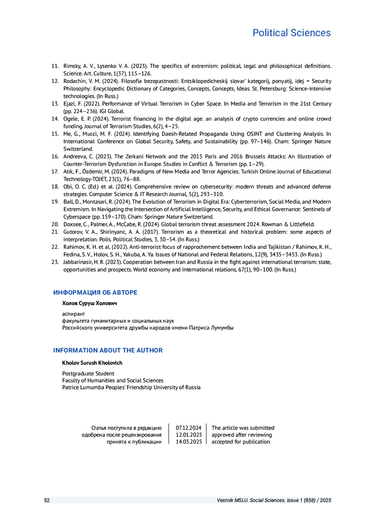 13. Ejazi F. Performance of Virtual Terrorism in Cyber Space // Media and Terrorism in the 21st Century. IGI Global, 2022. P. 224-236.