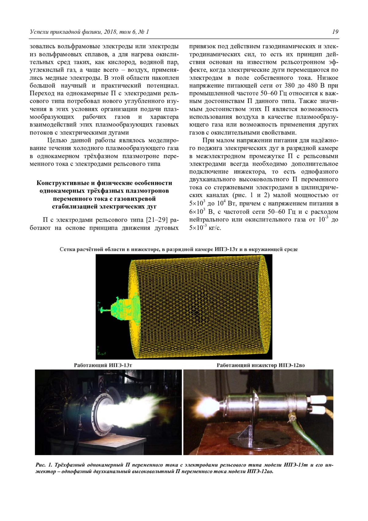БОРОВСКОЙ А. М. МОДЕЛИРОВАНИЕ ТЕЧЕНИЯ ХОЛОДНОГО ПЛАЗМООБРАЗУЮЩЕГО ГАЗА В ОДНОКАМЕРНОМ ТРЁХФАЗНОМ ПЛАЗМОТРОНЕ ПЕРЕМЕННОГО ТОКА С ЭЛЕКТРОДАМИ РЕЛЬСОВОГО ТИПА // УСПЕХИ ПРИКЛАДНОЙ ФИЗИКИ. 2018. ТОМ 6, №1