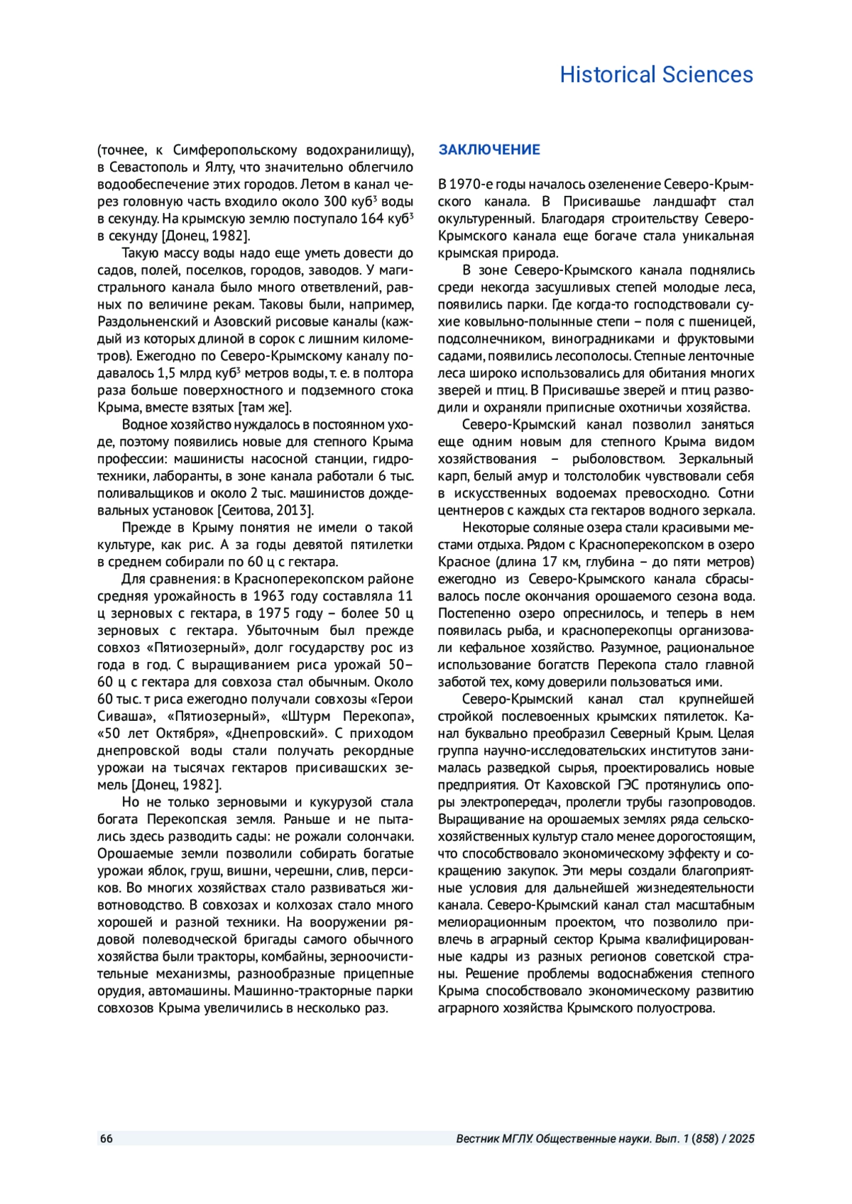 Северо-Крымский канал, как ряд и других наиболее крупных для народного хозяйства СССР строительных сооружений Советского Союза, был отнесен к «Великим стройкам коммунизма», стал крупнейшей стройкой послевоенных крымских пятилеток. Одну из причин решения передать Крым Украинской ССР ряд историков связывают с Северо-Крымским каналом. В статье рассматривается построение Северо-Крымского канала для орошения земель северных районов Крыма. Анализируются водные ресурсы Крыма: состояние запасов, водоснабжение и водоотведение, технологии очистки и т. п. Одна из главных проблем Северо-Крымского канала - полное и комплексное использование водных ресурсов. Одним из важнейших направлений в развитии экономики Крыма стало сельское хозяйство, а главной его задачей - наиболее полное удовлетворение потребностей гостей Крыма в сельскохозяйственной продукции. В степном Крыму с приходом днепровской воды ежегодно расширялись площади под орошаемыми культурами. Главная задача состояла в увеличении урожайности сельскохозяйственных культур. Строительство канала решило немало гидротехнических проблем.