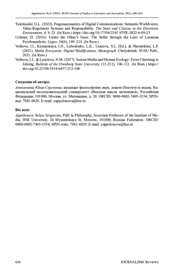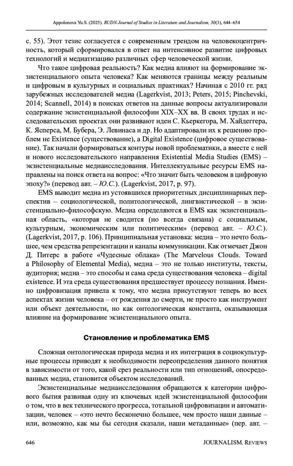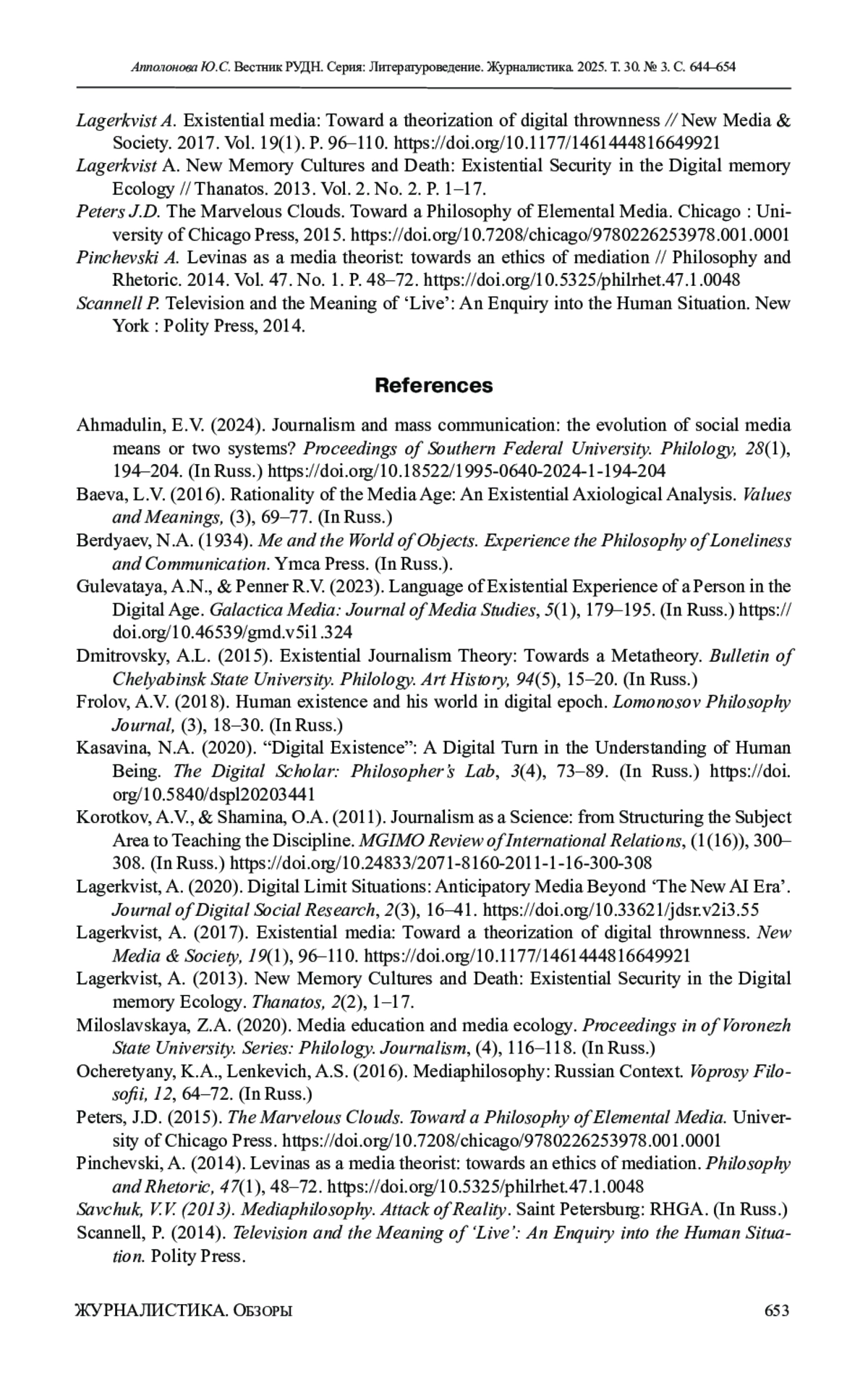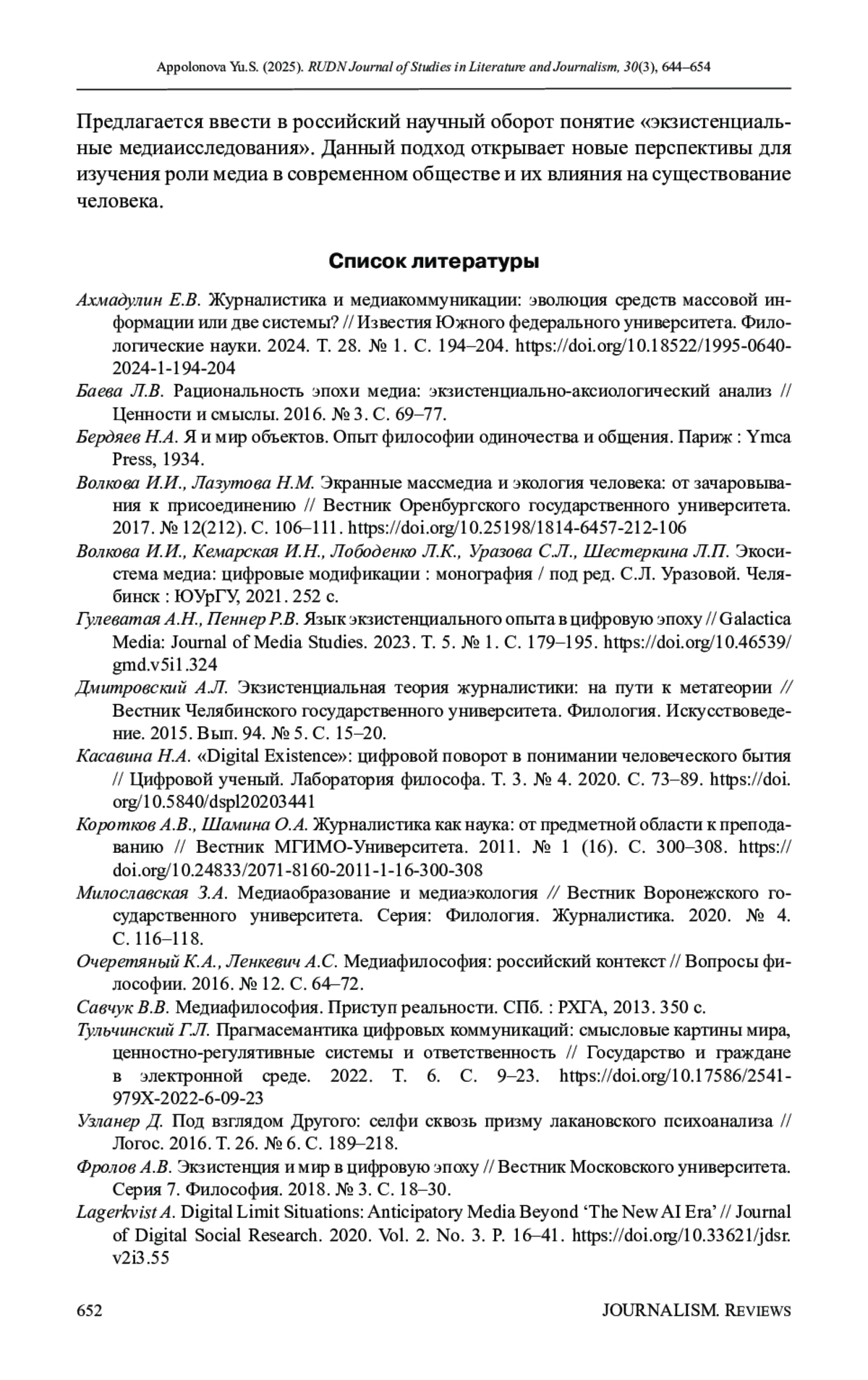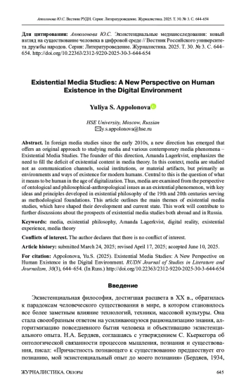 АППОЛОНОВА Ю. С. ЭКЗИСТЕНЦИАЛЬНЫЕ МЕДИАИССЛЕДОВАНИЯ: НОВЫЙ ВЗГЛЯД НА СУЩЕСТВОВАНИЕ ЧЕЛОВЕКА В ЦИФРОВОЙ СРЕДЕ // ВЕСТНИК РОССИЙСКОГО УНИВЕРСИТЕТА ДРУЖБЫ НАРОДОВ. СЕРИЯ: ЛИТЕРАТУРОВЕДЕНИЕ. ЖУРНАЛИСТИКА. 2025. ТОМ 30 № 3