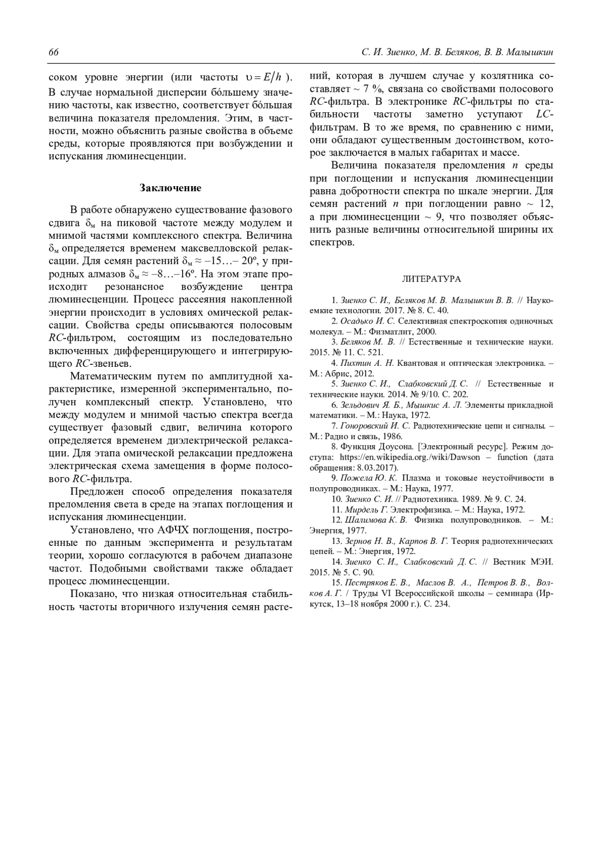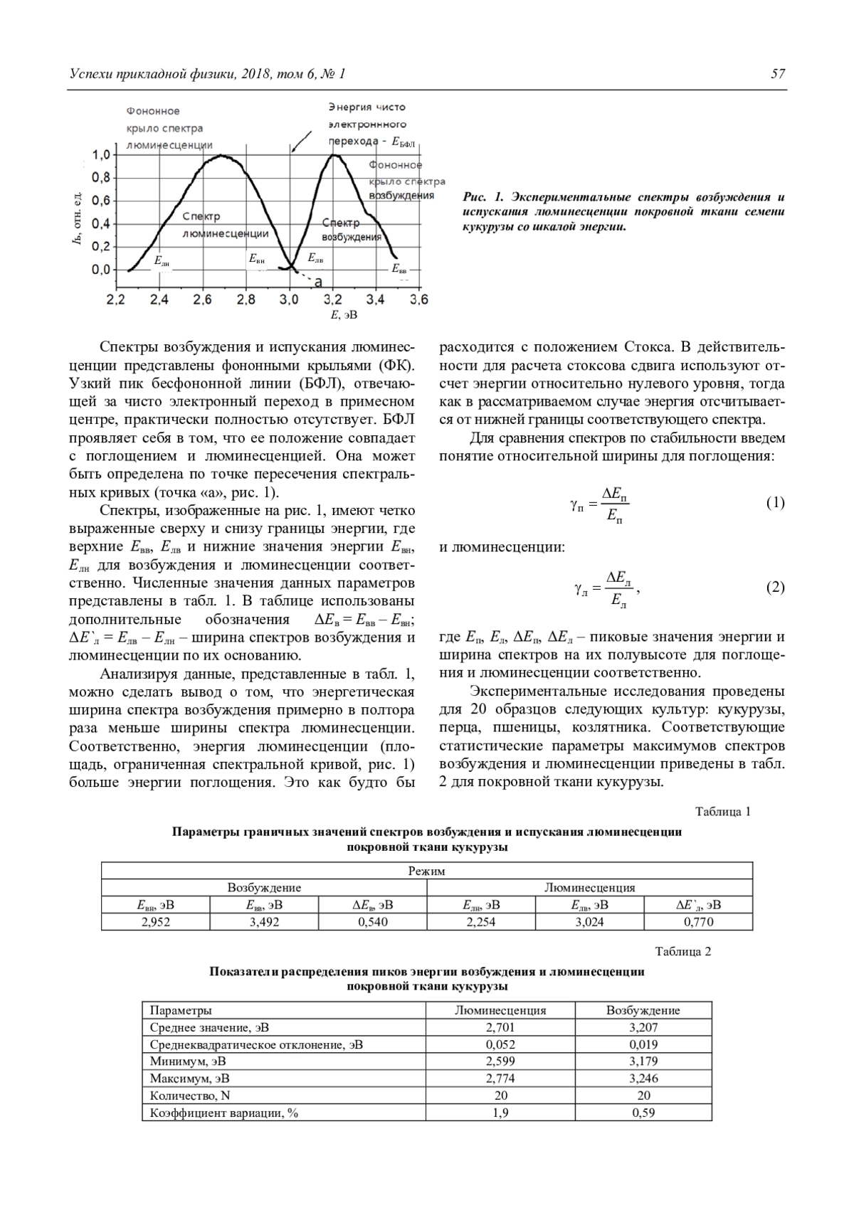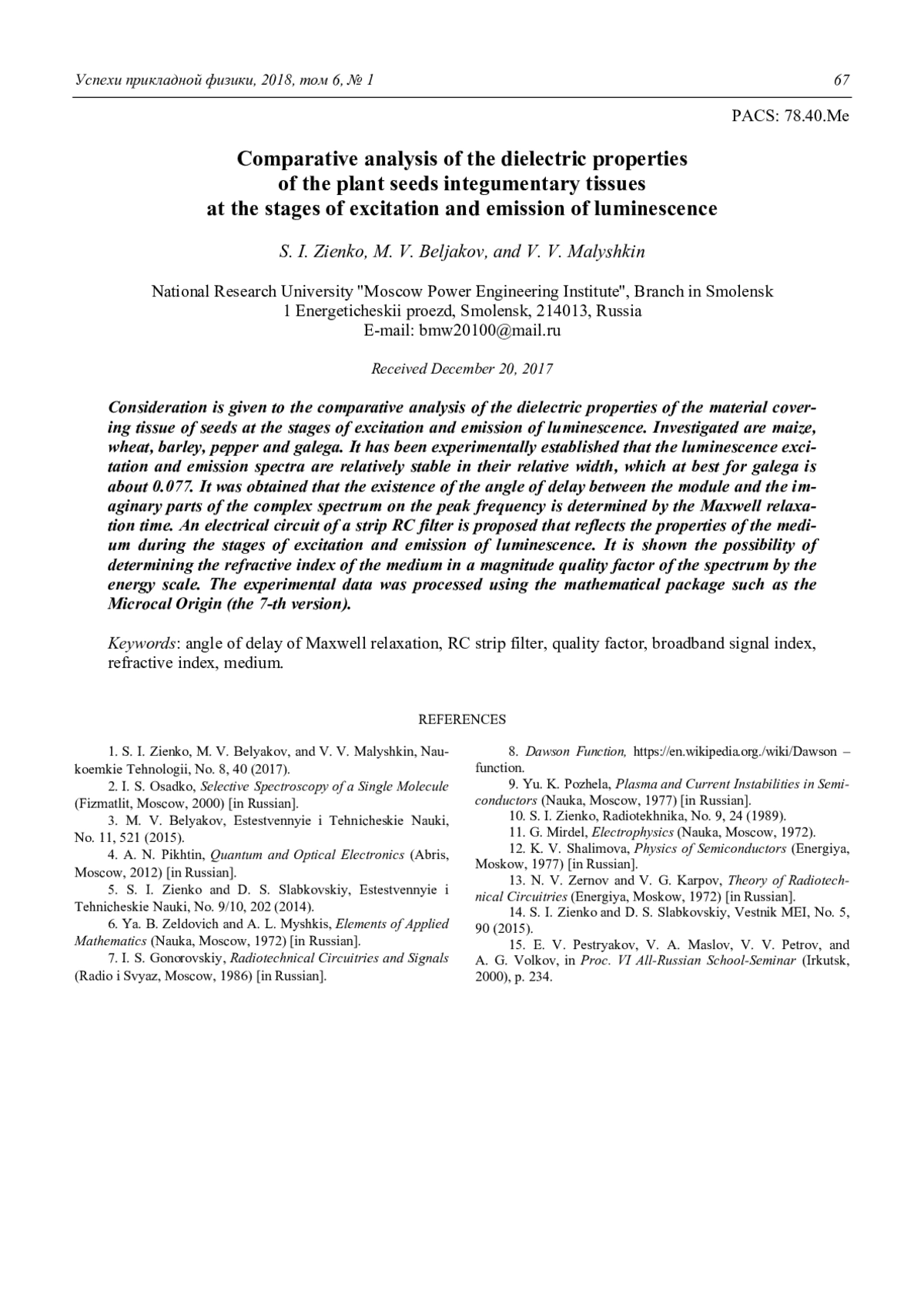 Статья посвящена комплексному исследованию диэлектрических свойств покровной ткани семян растений на стадиях возбуждения и испускания люминесценции: кукурузы, пшеницы, ячменя, перца и козлятника. Экспериментально установлена относительно низкая стабильность спектров возбуждения и испускания люминесценции по их относительной ширине, которая в лучшем случае для козлятника составляет, примерно, 0,077. Обнаружено существование между модулем и мнимой частью комплексного спектра на пиковой частоте угла задержки, величина которого определяется временем максвелловской релаксации. Предложена электрическая схема полосового RC-фильтра, отражающего свойства среды на этапах возбуждения и испускания люминесценции. Показана возможность определения показателя преломления среды по величине добротности спектра по шкале энергии. Обработка данных эксперимента выполнена с использованием математического пакета Microcal Origin (7 версия).