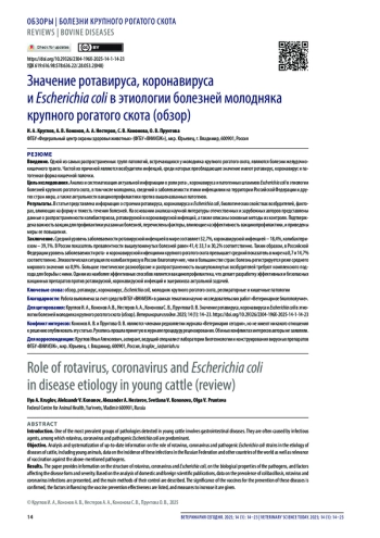 Цель исследования. Анализ и систематизация актуальной информации о роли рота-, коронавируса и патогенных штаммов Escherichia coli в этиологии болезней крупного рогатого скота, в том числе молодняка, сведений о заболеваемости этими инфекциями на территории Российской Федерации и других стран мира, а также актуальности вакцинопрофилактики против вышеназванных патогенов.
