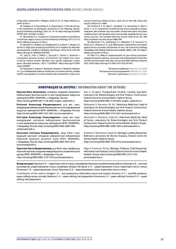 24. Скитович Г. С., Бьядовская О. П., Прохватилова Л. Б. Исследование сывороток крови на наличие специфических антител к рота- и коронавирусам среди разных возрастных групп поголовья крупного рогатого скота. Ветеринария сегодня. 2013; (3): 42-47.