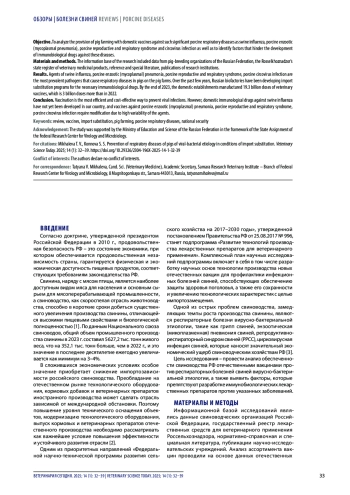 Материалы и методы. Информационной базой исследований являлись данные свиноводческих организаций Российской Федерации, государственный реестр лекарственных средств для ветеринарного применения Россельхознадзора, нормативно-справочная и специальная литература, публикации научно-исследовательских учреждений.