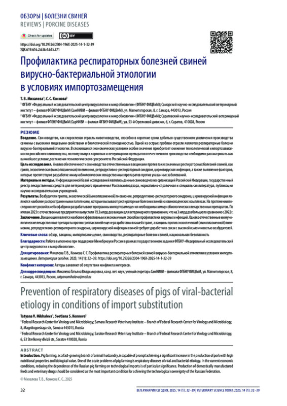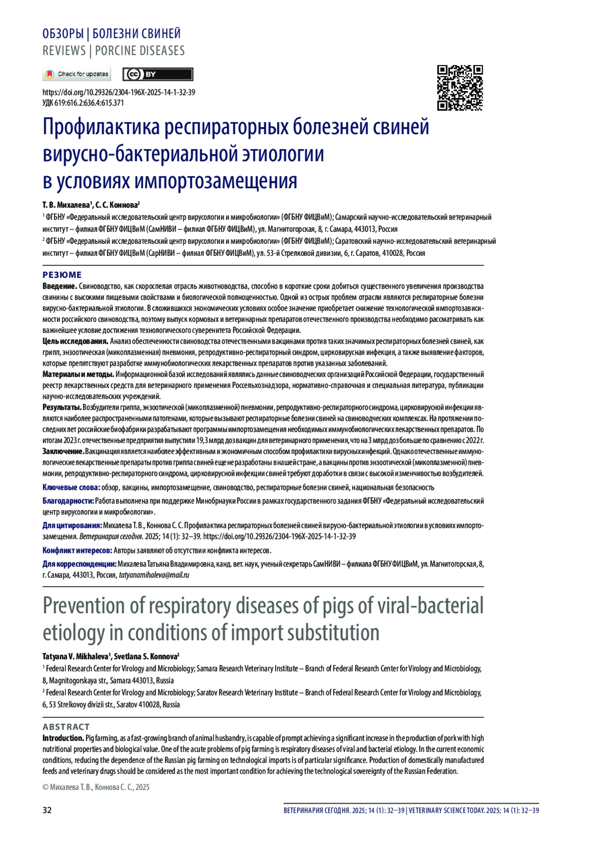 Введение. Свиноводство, как скороспелая отрасль животноводства, способно в короткие сроки добиться существенного увеличения производства свинины с высокими пищевыми свойствами и биологической полноценностью. Одной из острых проблем отрасли являются респираторные болезни вирусно-бактериальной этиологии. В сложившихся экономических условиях особое значение приобретает снижение технологической импортозависимости российского свиноводства, поэтому выпуск кормовых и ветеринарных препаратов отечественного производства необходимо рассматривать как важнейшее условие достижения технологического суверенитета Российской Федерации.