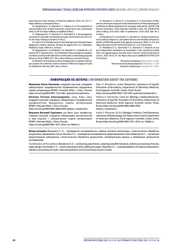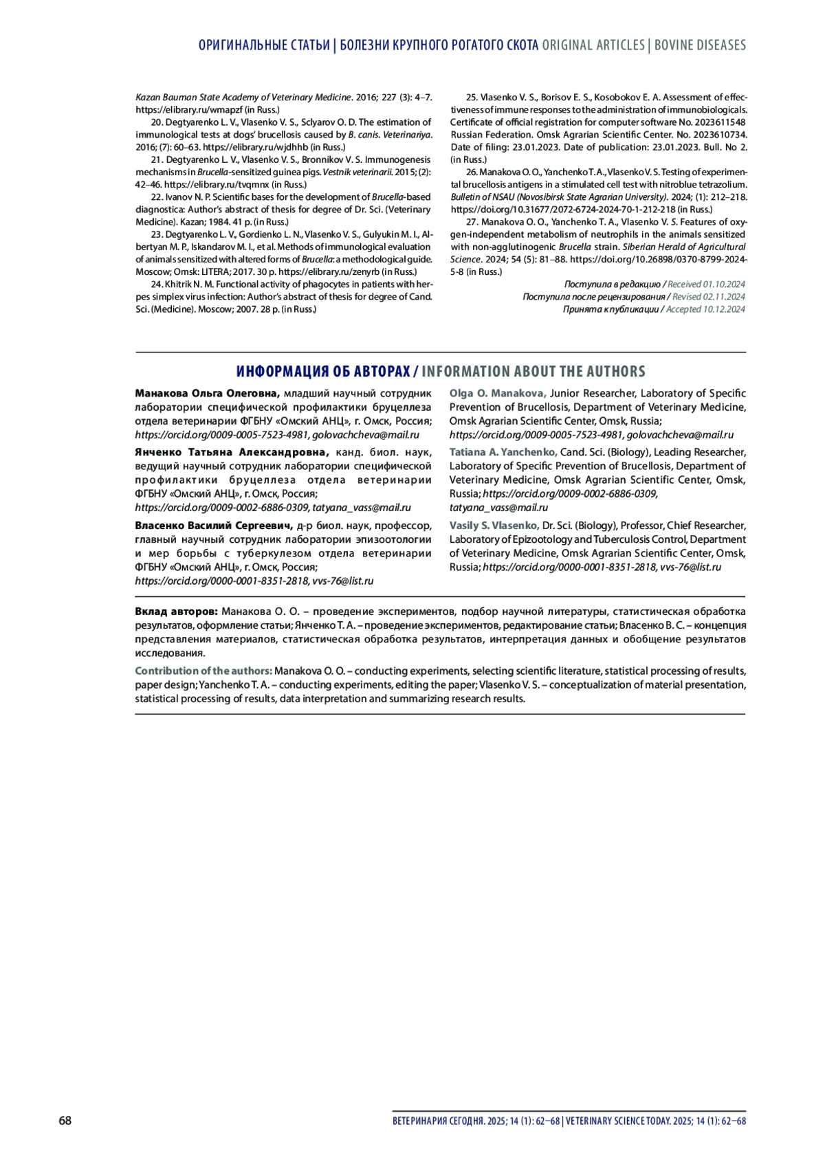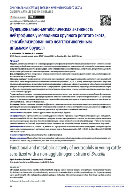 МАНАКОВА О. О., ЯНЧЕНКО Т. А., ВЛАСЕНКО В. С. ФУНКЦИОНАЛЬНО-МЕТАБОЛИЧЕСКАЯ АКТИВНОСТЬ НЕЙТРОФИЛОВ У МОЛОДНЯКА КРУПНОГО РОГАТОГО СКОТА, СЕНСИБИЛИЗИРОВАННОГО НЕАГГЛЮТИНОГЕННЫМ ШТАММОМ БРУЦЕЛЛ // ВЕТЕРИНАРИЯ СЕГОДНЯ. 2025. № 1, ТОМ 14