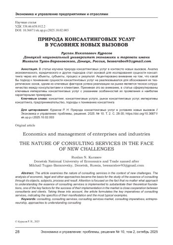 В статье изучена природа консалтинговых услуг в контексте новых вызовов. Анализ экономического, юридического и других подходов стал основой для исследования сущности консалтинга через его объекты, субъекты, процесс и результат. Акцентировано внимание на том, что какой бы подход к пониманию сущности консалтинговых услуг не реализовывался для обоснования их теоретических основ, одним из ключевых факторов успеха реализации на рынке является тесное сотрудничество между консультантами и клиентами. Принимая это во внимание, в статье сформулированы ключевые императивы консалтинговых услуг с указанием особенностей их проявления и наиболее характерными примерами.