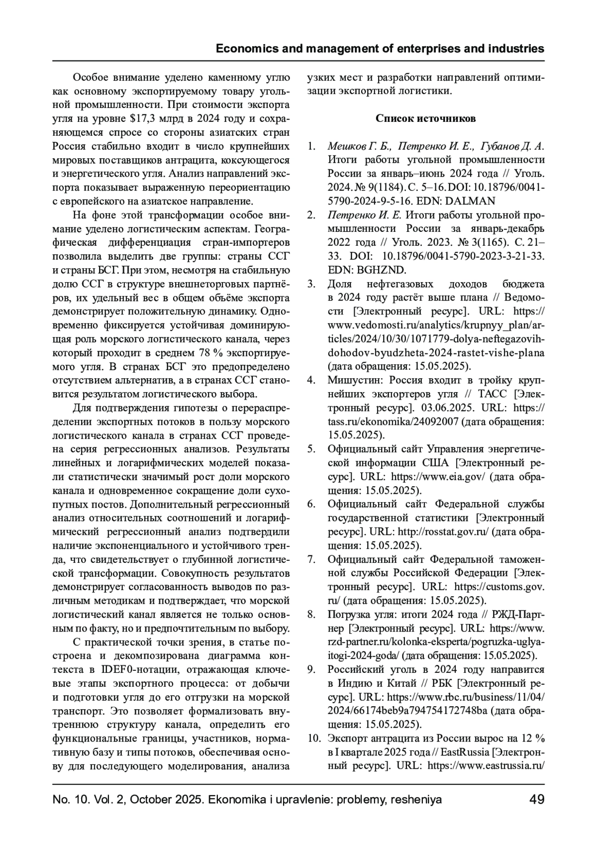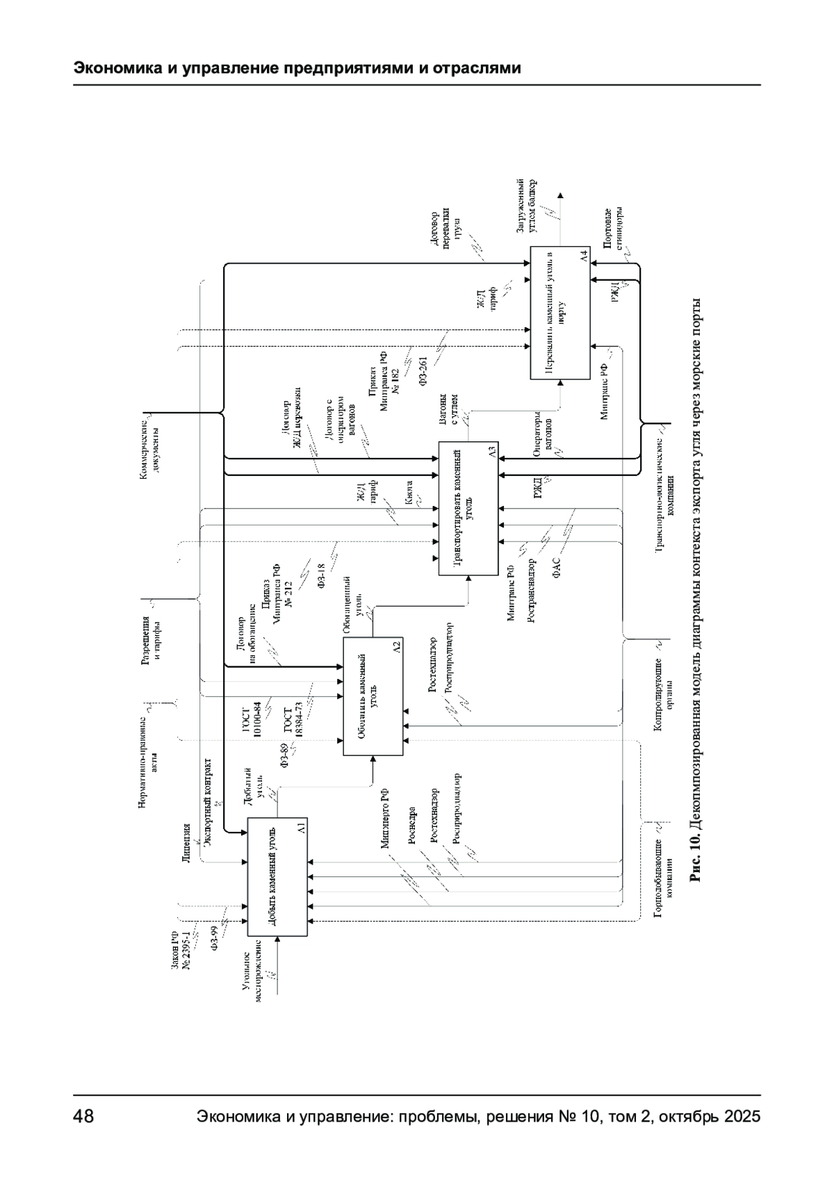 В статье исследуется трансформация логистических каналов экспорта каменного угля из России в условиях географической дифференциации внешнеторговых направлений. На основе статистических данных 2015-2024 гг. проведён комплекс регрессионных анализов (линейная, относительная и логарифмическая модели), позволивших выявить устойчивую тенденцию перераспределения экспортных потоков в пользу морских портов. Полученные результаты подтвердили снижение роли сухопутных маршрутов и формирование структурного сдвига в логистической архитектуре поставок в страны, имеющие сухопутную границу с Россией. Построение диаграммы контекста в нотации IDEF0 и её декомпозиция обеспечили формализацию морского логистического канала как единого функционального блока, включающего ключевых участников, нормативно-правовую базу и инфраструктурные элементы. Практическая ценность исследования заключается в возможности применения полученной модели для анализа узких мест, оптимизации и повышения устойчивости экспортной логистики.