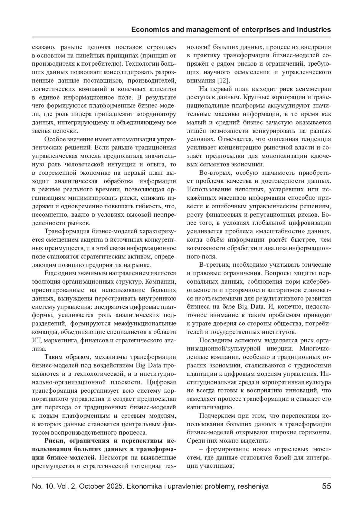 Статья посвящена анализу трансформации бизнес-моделей под воздействием технологий больших данных в современной экономике. Рассматриваются теоретико-методологические основы применения больших данных, их влияние на стратегическое управление предприятиями и институциональные ограничения цифровой модернизации. Особое внимание уделено вопросам адаптации традиционных моделей бизнеса к новым технологическим условиям и выявлению рисков цифровизации. В табличном виде обобщены количественные показатели, иллюстрирующие влияние внедрения технологий больших данных на трансформацию бизнес-моделей российских компаний. Внедрение технологий больших данных характеризует положительный эффект ключевых параметров бизнес-моделей российских компаний: ускорение процессов, рост доходности и увеличение доли новых продуктов в выручке. На основании анализа отечественных исследований выявлены ключевые направления изменений, включая повышение гибкости бизнес-процессов, интеграцию аналитических инструментов и усиление клиентоориентированности.