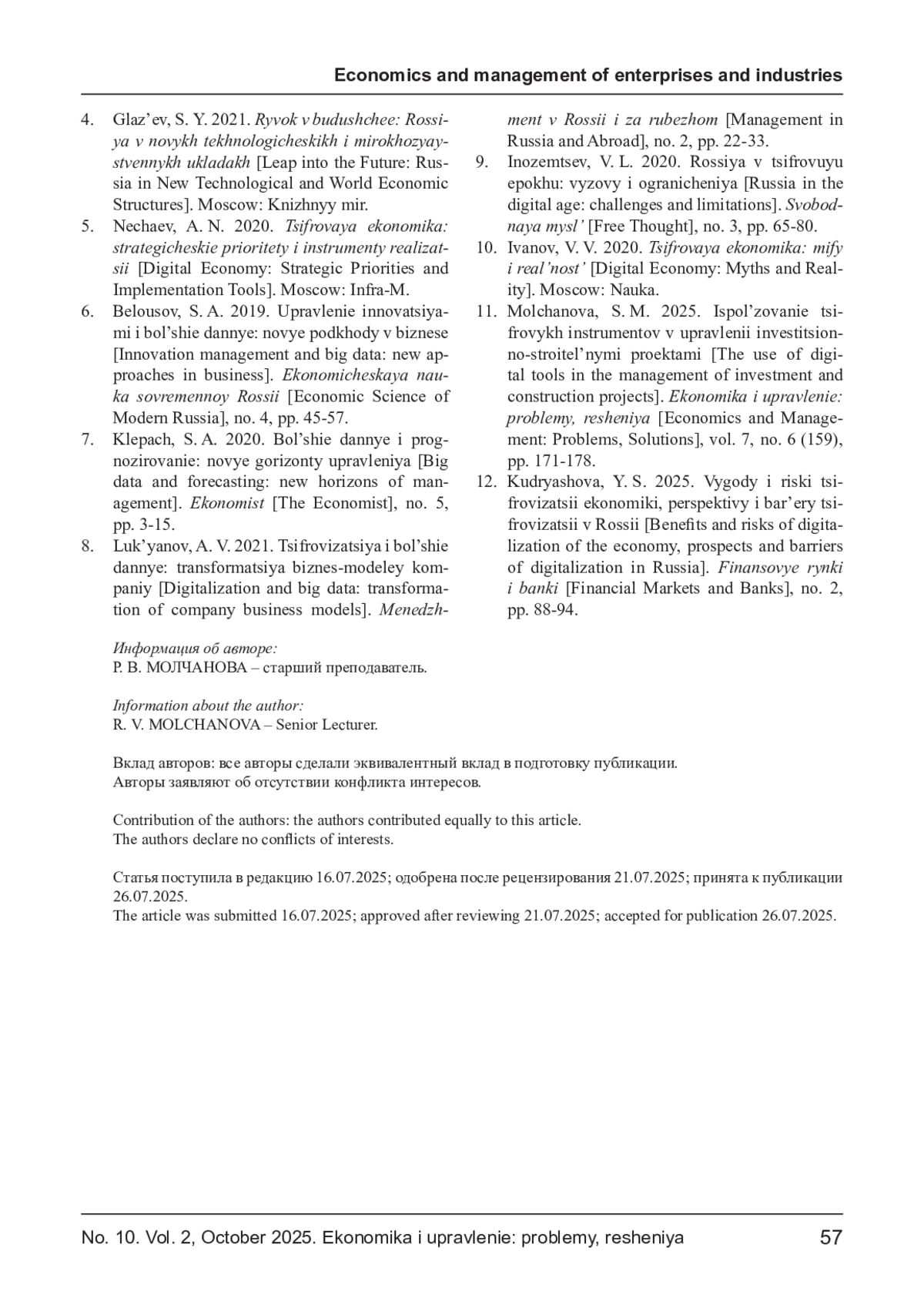 10. Иванов В. В. Цифровая экономика: мифы и реальность. М.: Наука, 2020. 256 с.