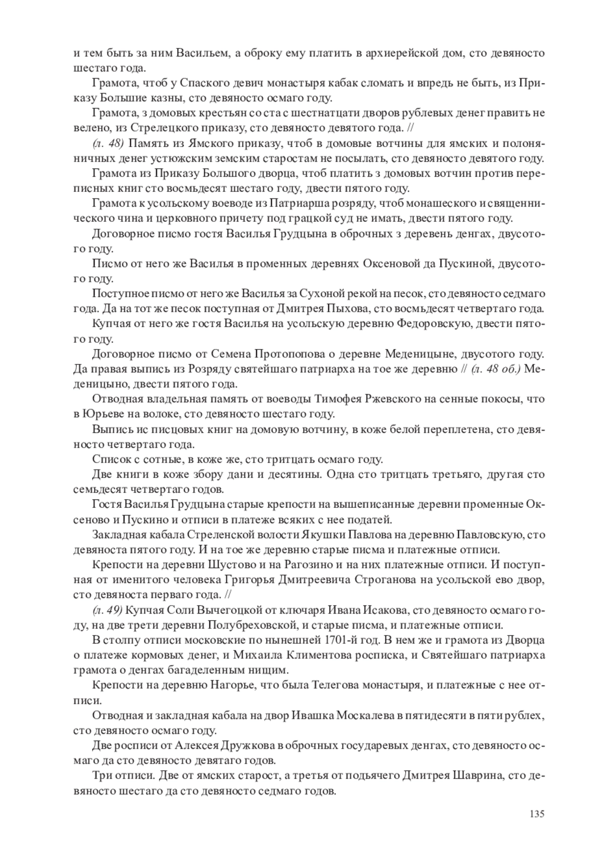 Одной из задач описания церковно-монастырских владений и имуществ начала XVIII в., производившегося по именному указу от 31 января 1701 г., являлась фиксация документально подтвержденных прав Русской православной церкви на земли, угодья и различные промыслы, городские и посадские дворы и т. п.1 Согласно “типовому” наказу переписчикам из Монастырского приказа, текст которого недавно опубликован, они должны были “жалованные грамоты, и вкладные, и иные всякие вотчинные крепости, и зделочные писма по тому же пересмотреть и переписать все имянно”2. Соответственно, в описных книгах, как правило, находят отражение сведения о монастырских и архиерейских документальных собраниях. Следует подчеркнуть, что архивы архиерейских домов, несмотря на публикацию ряда их описей, остаются менее изученными по сравнению с монастырскими3.