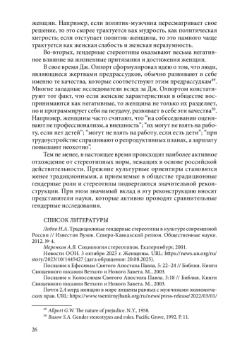 Настоящая статья продолжает тему генезиса, распространения и функционирования в обществе социальных стереотипов — схематизированных, стандартизированных, обычно эмоционально окрашенных и обладающих высокой устойчивостью представлений о социальном объекте. Как правило, стереотипы воспринимаются некритически и часто просто принимаются “на веру”, поэтому не только способствуют неполному или искаженному восприятию окружающей действительности, но и реально влияют на массовое сознание и индивидуальное поведение. В числе наиболее распространенных разновидностей стереотипов расово — этнические стереотипы, аккумулирующие набор представлений о внешности, уровне интеллекта и характере представителей разных этносов; возрастные стереотипы, получившие название “эйджизм” и стандартизирующие поведение и возможности людей в зависимости от возраста; религиозные стереотипы, воплощающие набор представлений о содержании религиозных доктрин или представителях разных конфессий; социально-классовые стереотипы, маркирующие людей в зависимости от уровня материального достатка или социального статуса. Стереотипы также укоренены во всех сферах социальной жизни, в связи с чем выделяют экономические, политические, профессиональные и т. п. стереотипы. В гендерных стереотипных представлениях, которые являются наиболее распространенными, очевидно изначально четкое распределение социальных ролей и обязанностей полов, исторически восходящее к патриархальному общественному устою, закрепляющему превосходство мужчины во всех сферах социальной жизни. История эволюции социальных отношений, в том числе и гендерных, свидетельствует о том, что патриархальные взгляды и стереотипные представления о женственности и мужественности медленно, но уверенно шли по пути обновлений. Значительный вклад в данный процесс внесло феминистское движение, выступающее как за возрастающую социальную роль женщин, так и за право женщины определять себя как самостоятельную личность. Однако гендерные стереотипы все же продолжают сохраняться в культурной основе социальной реальности, и проявляют себя в различных областях социальной жизни, хотя и в более завуалированной форме. В статье рассматриваются три основные группы гендерных стереотипов, в соответствии с которыми на протяжении долгого времени выстраивались маркеры и образцы поведения мужчины и женщины. Их генезис, а также факторы, влияющие на укрепление в обществе, нашел отражение в многочисленных социологических исследованиях, которые являются особым предметом анализа в рамках настоящей статьи.