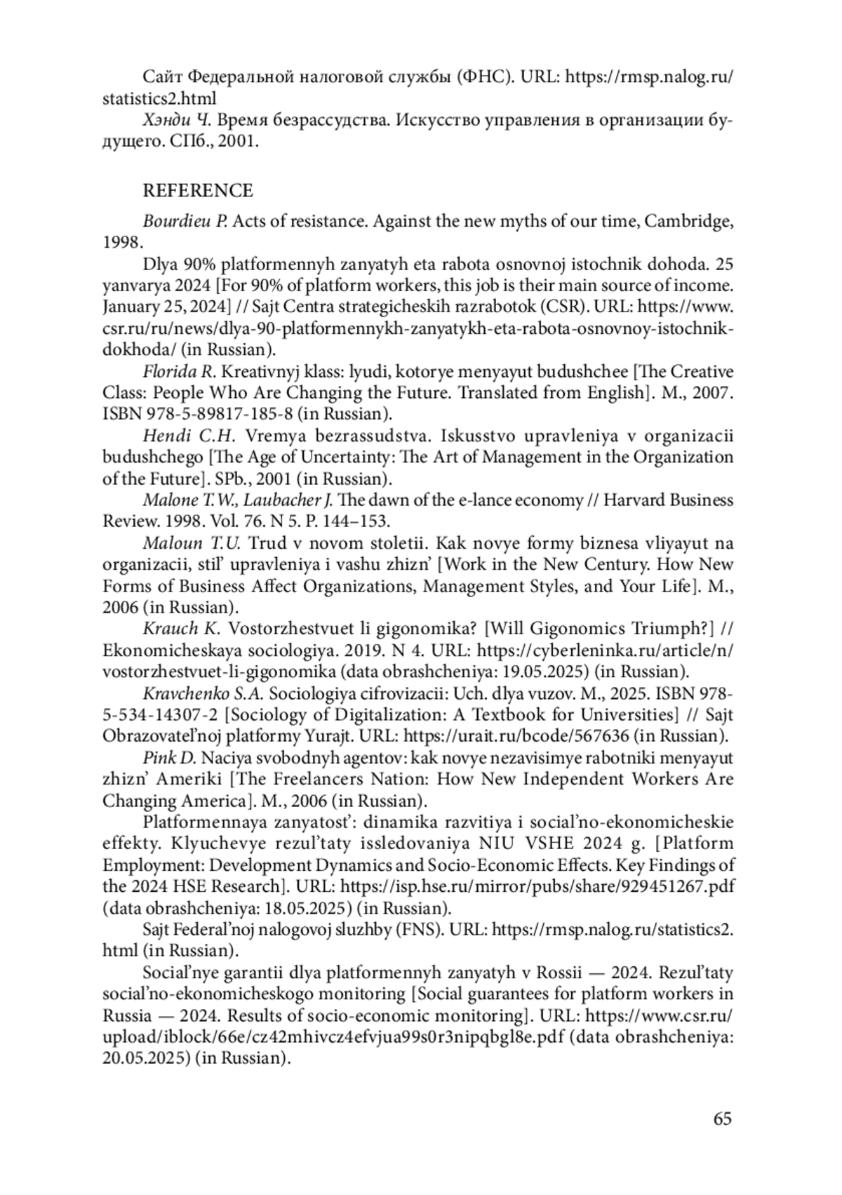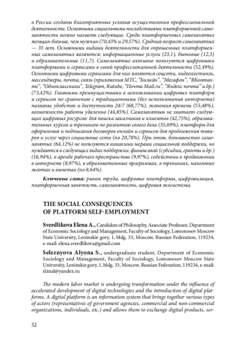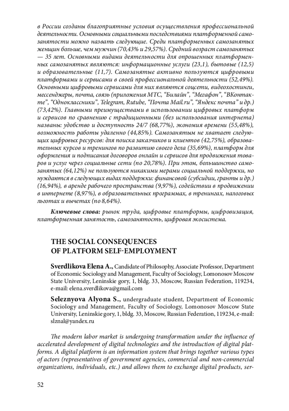 СВЕРДЛИКОВА Е. А., СЕЛЕЗНЁВА А. С. СОЦИАЛЬНЫЕ ПОСЛЕДСТВИЯ ПЛАТФОРМЕННОЙ САМОЗАНЯТОСТИ // ВЕСТНИК МОСКОВСКОГО УНИВЕРСИТЕТА. СЕРИЯ 18. СОЦИОЛОГИЯ И ПОЛИТОЛОГИЯ. 2025. ТОМ 31 № 4