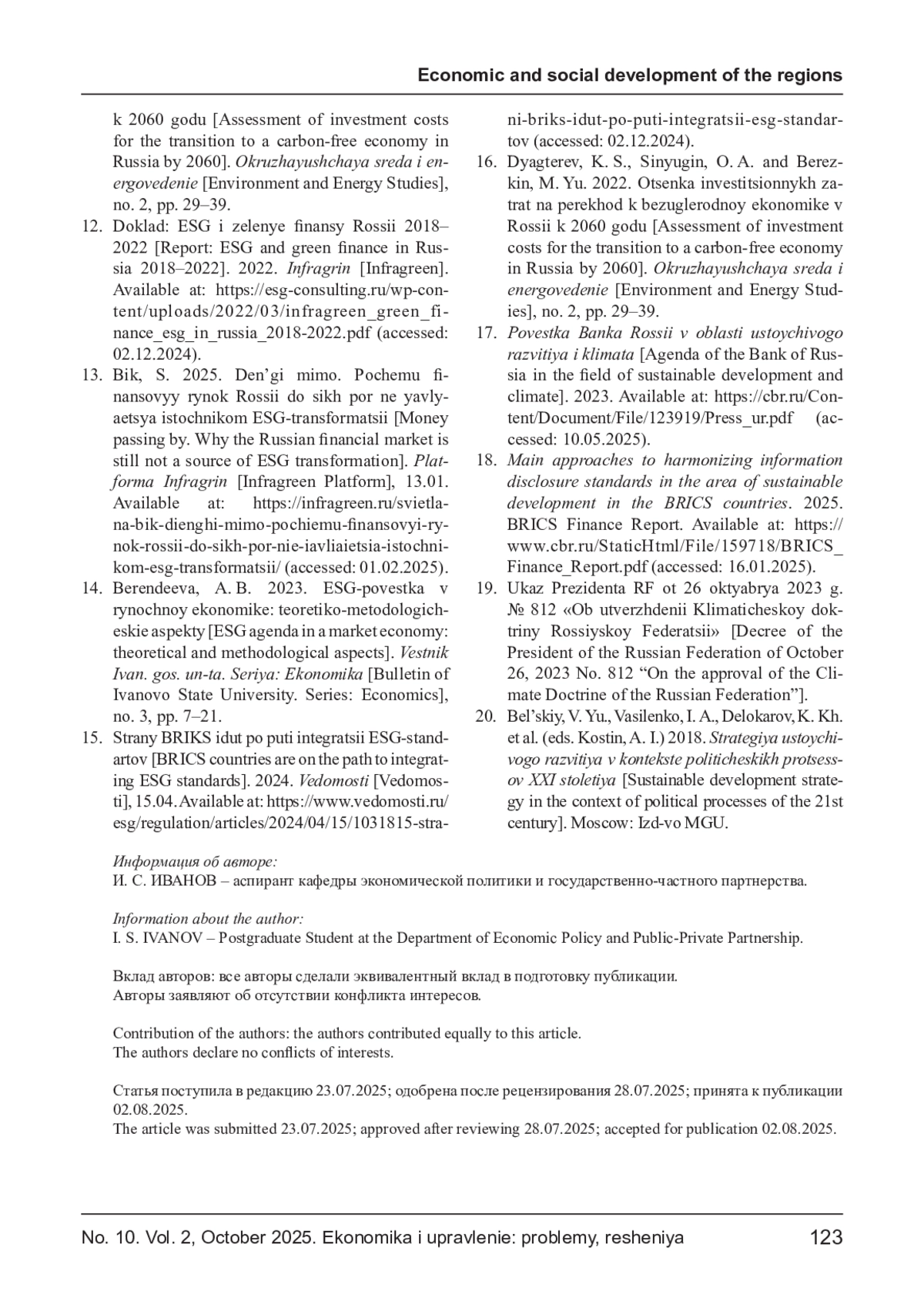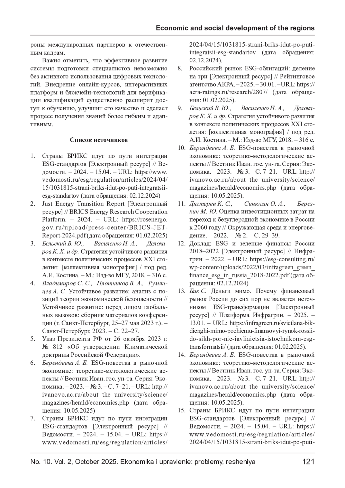 10. Берендеева А. Б. ESG-повестка в рыночной экономике: теоретико-методологические аспекты // Вестник Иван. гос. ун-та. Серия: Экономика. - 2023. - № 3. - С. 7-21. - URL:http://ivanovo.ac.ru/about_the_university/science/magazines/herald/economics.php (дата обращения: 10.05.2025).